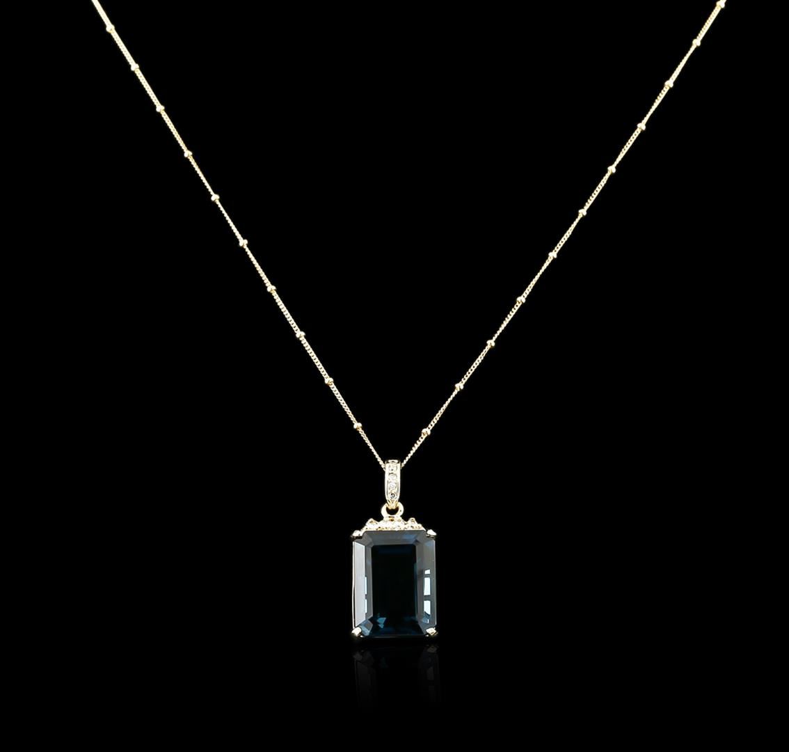 One electronically tested 14KT yellow gold ladies combination cast & assembled topaz and diamond pendant & chain 18.0" long, thin with a lobster claw clasp with a bright polish finish. Identified with markings of "14K". Condition is new. Containing: One prong set emerald standard step cut natural blue topaz, measuring 19.92 x 15.04 x 11.00mm, approximate weight of 31.41ct., clarity is eye clean, type I, medium, very slightly grayish, greenish blue color, (GIA gB 5/3), cut is good. Thirteen prong set round brilliant cut diamonds, measuring 2.00 - 1.50 x 1.05mm (depth est.) approximate total weight of 13 Stones = 0.26ct. Clarity: SI-1 to I-1. Color: K - L, Cut is Good. Diamonds and colored gemstones are graded in the mounting, unless otherwise stated. Colored gemstones are presumed to have been subjected to commonly used enhancement processes. Total Weight of Colored Stones 31.41ct. Total Weight of Diamonds 0.26ct. Total Weight of Pendant & Chain 13.20 grams. GGL Appraised at $2,090.00.