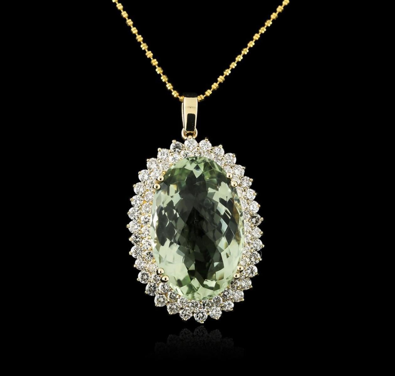One electronically tested 14KT yellow gold ladies combination cast & assembled amethyst and diamond pendant & chain 18.0" long, thin double bead link with a spring ring clasp with a bright polish finish. Identified with markings of "14K". Condition is new. Containing: One prong set oval modified mixed cut natural amethyst, measuring 27.00 x 18.00 x 11.70mm, approximate weight of 31.76ct., clarity is eye clean, light, very slightly grayish, green color, (GIA gB 3/3), cut is very good. Sixty-Eight prong set round brilliant cut diamonds, measuring 2.50 - 2.00 x 1.35mm (depth est.) approximate total weight of 68 Stones = 2.83ct. Clarity: SI-2 to I-2. Color: K - L, Cut is Good. Diamonds and colored gemstones are graded in the mounting, unless otherwise stated. Colored gemstones are presumed to have been subjected to commonly used enhancement processes. Total Weight of Colored Stones 31.76ct. Total Weight of Diamonds 2.83ct. Total Weight of Pendant & Chain 20.00 grams. GGL Appraised.