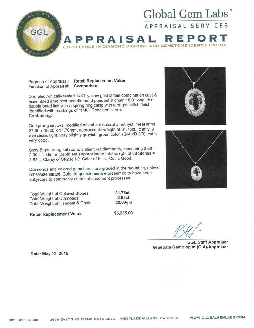 One electronically tested 14KT yellow gold ladies combination cast & assembled amethyst and diamond pendant & chain 18.0" long, thin double bead link with a spring ring clasp with a bright polish finish. Identified with markings of "14K". Condition is new. Containing: One prong set oval modified mixed cut natural amethyst, measuring 27.00 x 18.00 x 11.70mm, approximate weight of 31.76ct., clarity is eye clean, light, very slightly grayish, green color, (GIA gB 3/3), cut is very good. Sixty-Eight prong set round brilliant cut diamonds, measuring 2.50 - 2.00 x 1.35mm (depth est.) approximate total weight of 68 Stones = 2.83ct. Clarity: SI-2 to I-2. Color: K - L, Cut is Good. Diamonds and colored gemstones are graded in the mounting, unless otherwise stated. Colored gemstones are presumed to have been subjected to commonly used enhancement processes. Total Weight of Colored Stones 31.76ct. Total Weight of Diamonds 2.83ct. Total Weight of Pendant & Chain 20.00 grams. GGL Appraised.