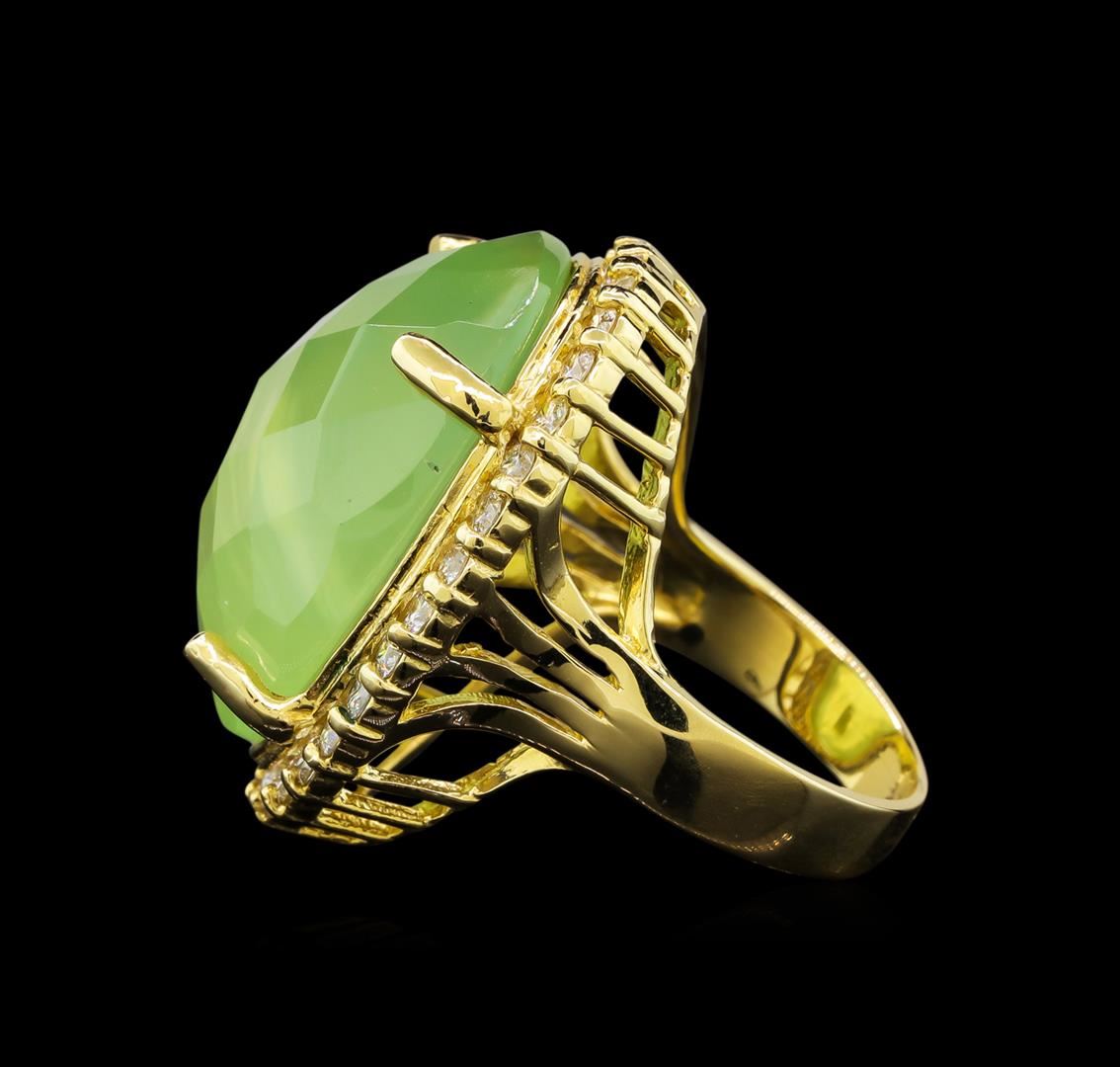 One electronically tested 14KT yellow gold ladies cast tourmaline and diamond ring with a bright polish finish. Identified with markings of "14K". Condition is new. Containing: One prong set oval cabochon cut natural green tourmaline, measuring 24.00. x 18.00. x 9.00.mm, approximate weight of 32.12ct., clarity is heavily included, type I, light, very slightly grayish, green color, (GIA G 3/3), cut is good. Thirty-Four prong set round brilliant cut diamonds, measuring 1.90 - 1.90 x 1.14mm (depth est.) approximate total weight of 34 Stones = 0.85ct. Clarity: SI-2 to I-2. Color: I - J, Cut is Good. Colored gemstones are presumed to have been subjected to commonly used enhancement processes. All diamonds and colored gemstones are graded in the mounting, unless otherwise stated. Total Weight of Colored Stones 32.12ct. Total Weight of Diamonds 0.85ct. Total Weight of Ring 12.10 grams. GGL Appraised at $4,580.00.