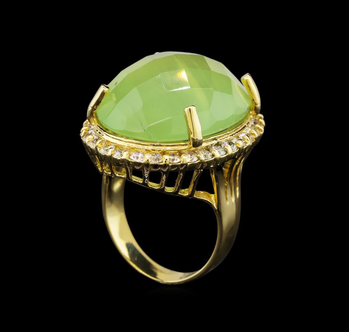 One electronically tested 14KT yellow gold ladies cast tourmaline and diamond ring with a bright polish finish. Identified with markings of "14K". Condition is new. Containing: One prong set oval cabochon cut natural green tourmaline, measuring 24.00. x 18.00. x 9.00.mm, approximate weight of 32.12ct., clarity is heavily included, type I, light, very slightly grayish, green color, (GIA G 3/3), cut is good. Thirty-Four prong set round brilliant cut diamonds, measuring 1.90 - 1.90 x 1.14mm (depth est.) approximate total weight of 34 Stones = 0.85ct. Clarity: SI-2 to I-2. Color: I - J, Cut is Good. Colored gemstones are presumed to have been subjected to commonly used enhancement processes. All diamonds and colored gemstones are graded in the mounting, unless otherwise stated. Total Weight of Colored Stones 32.12ct. Total Weight of Diamonds 0.85ct. Total Weight of Ring 12.10 grams. GGL Appraised at $4,580.00.