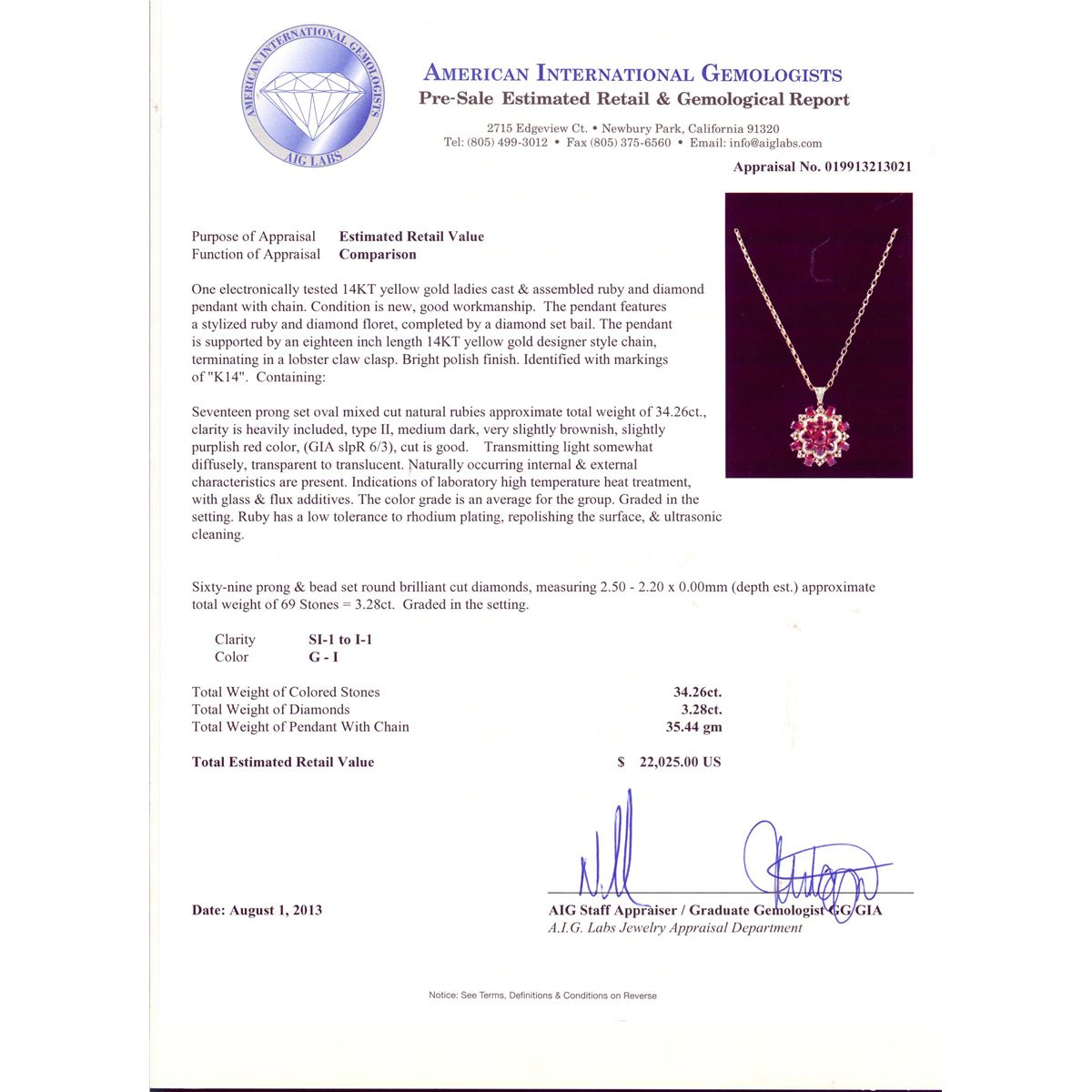 One electronically tested 14KT yellow gold ladies cast & assembled ruby and diamond pendant with chain. Condition is new, good workmanship. The pendant features a stylized ruby and diamond floret, completed by a diamond set bail. The pendant is supported by an eighteen inch length 14KT yellow gold designer style chain, terminating in a lobster claw clasp. Bright polish finish. Identified with markings of "K14". Containing: Seventeen prong set oval mixed cut natural rubies approximate total weight of 34.26ct., clarity is heavily included, type II, medium dark, very slightly brownish, slightly purplish red color, (GIA slpR 6/3), cut is good. Transmitting light somewhat diffusely, transparent to translucent. Naturally occurring internal & external characteristics are present. Indications of laboratory high temperature heat treatment, with glass & flux additives. The color grade is an average for the group. Graded in the setting. Ruby has a low tolerance to rhodium plating, repolishing the surface, & ultrasonic cleaning. Sixty-nine prong & bead set round brilliant cut diamonds, measuring 2.50 - 2.20 x 0.00mm (depth est.) approximate total weight of 69 Stones = 3.28ct. Graded in the setting. Clarity SI-1 to I-1. Color G - I. Total Weight of Colored Stones 34.26ct. Total Weight of Diamonds 3.28ct. Total Weight of Pendant With Chain 35.44gm. AIG Appraised at $22,025.00.