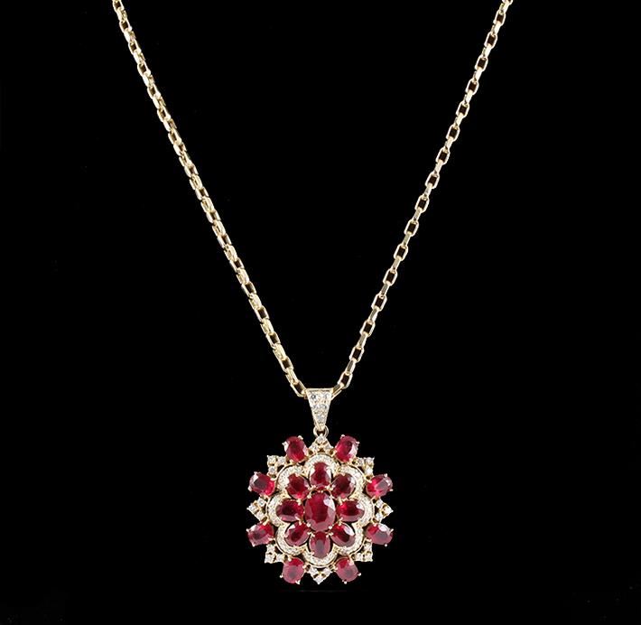 One electronically tested 14KT yellow gold ladies cast & assembled ruby and diamond pendant with chain. Condition is new, good workmanship. The pendant features a stylized ruby and diamond floret, completed by a diamond set bail. The pendant is supported by an eighteen inch length 14KT yellow gold designer style chain, terminating in a lobster claw clasp. Bright polish finish. Identified with markings of "K14". Containing: Seventeen prong set oval mixed cut natural rubies approximate total weight of 34.26ct., clarity is heavily included, type II, medium dark, very slightly brownish, slightly purplish red color, (GIA slpR 6/3), cut is good. Transmitting light somewhat diffusely, transparent to translucent. Naturally occurring internal & external characteristics are present. Indications of laboratory high temperature heat treatment, with glass & flux additives. The color grade is an average for the group. Graded in the setting. Ruby has a low tolerance to rhodium plating, repolishing the surface, & ultrasonic cleaning. Sixty-nine prong & bead set round brilliant cut diamonds, measuring 2.50 - 2.20 x 0.00mm (depth est.) approximate total weight of 69 Stones = 3.28ct. Graded in the setting. Clarity SI-1 to I-1. Color G -- I. Total Weight of Colored Stones 34.26ct. Total Weight of Diamonds 3.28ct. Total Weight of Pendant With Chain 35.44gm. AIG Appraised at $22,025.00.