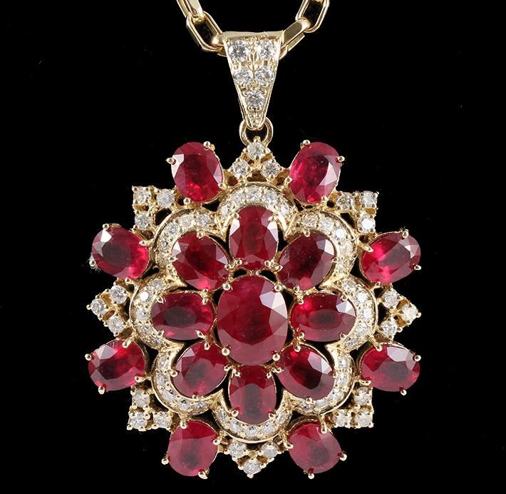 One electronically tested 14KT yellow gold ladies cast & assembled ruby and diamond pendant with chain. Condition is new, good workmanship. The pendant features a stylized ruby and diamond floret, completed by a diamond set bail. The pendant is supported by an eighteen inch length 14KT yellow gold designer style chain, terminating in a lobster claw clasp. Bright polish finish. Identified with markings of "K14". Containing: Seventeen prong set oval mixed cut natural rubies approximate total weight of 34.26ct., clarity is heavily included, type II, medium dark, very slightly brownish, slightly purplish red color, (GIA slpR 6/3), cut is good. Transmitting light somewhat diffusely, transparent to translucent. Naturally occurring internal & external characteristics are present. Indications of laboratory high temperature heat treatment, with glass & flux additives. The color grade is an average for the group. Graded in the setting. Ruby has a low tolerance to rhodium plating, repolishing the surface, & ultrasonic cleaning. Sixty-nine prong & bead set round brilliant cut diamonds, measuring 2.50 - 2.20 x 0.00mm (depth est.) approximate total weight of 69 Stones = 3.28ct. Graded in the setting. Clarity SI-1 to I-1. Color G -- I. Total Weight of Colored Stones 34.26ct. Total Weight of Diamonds 3.28ct. Total Weight of Pendant With Chain 35.44gm. AIG Appraised at $22,025.00.