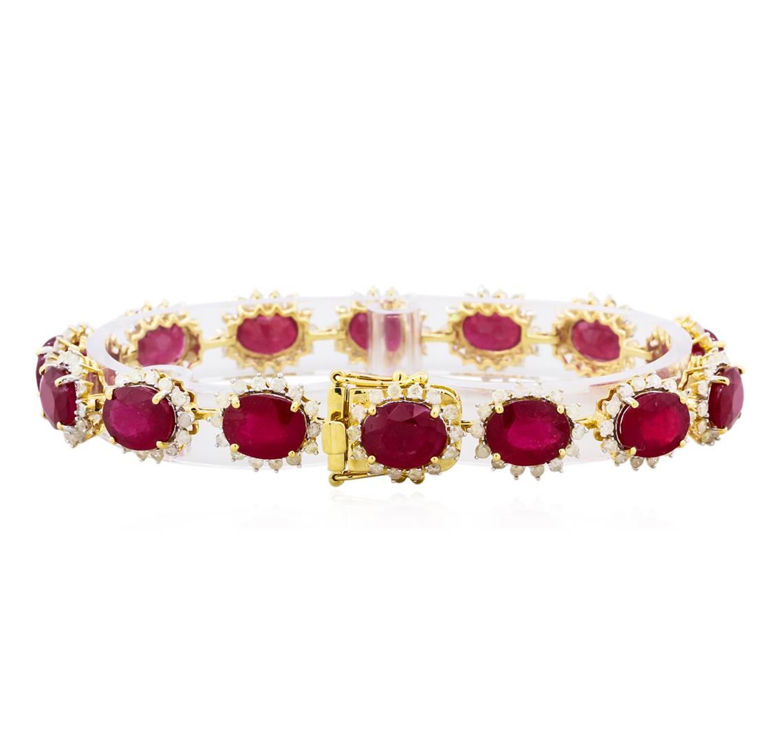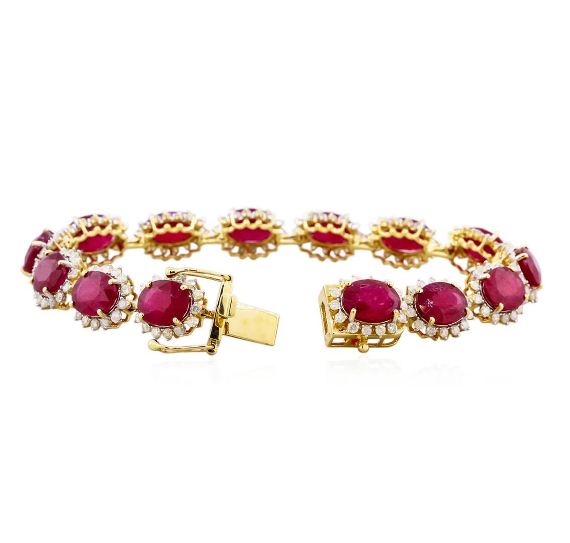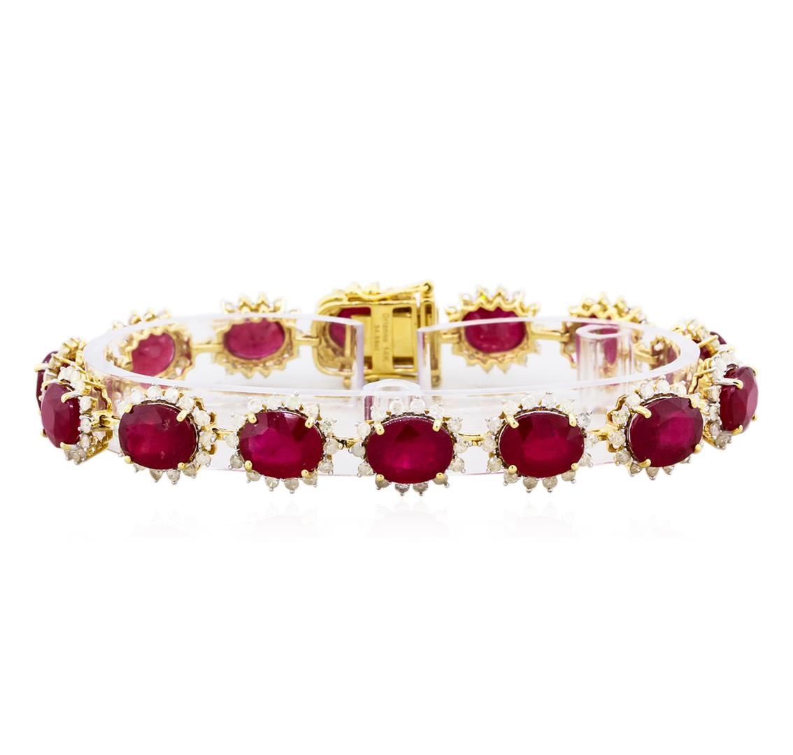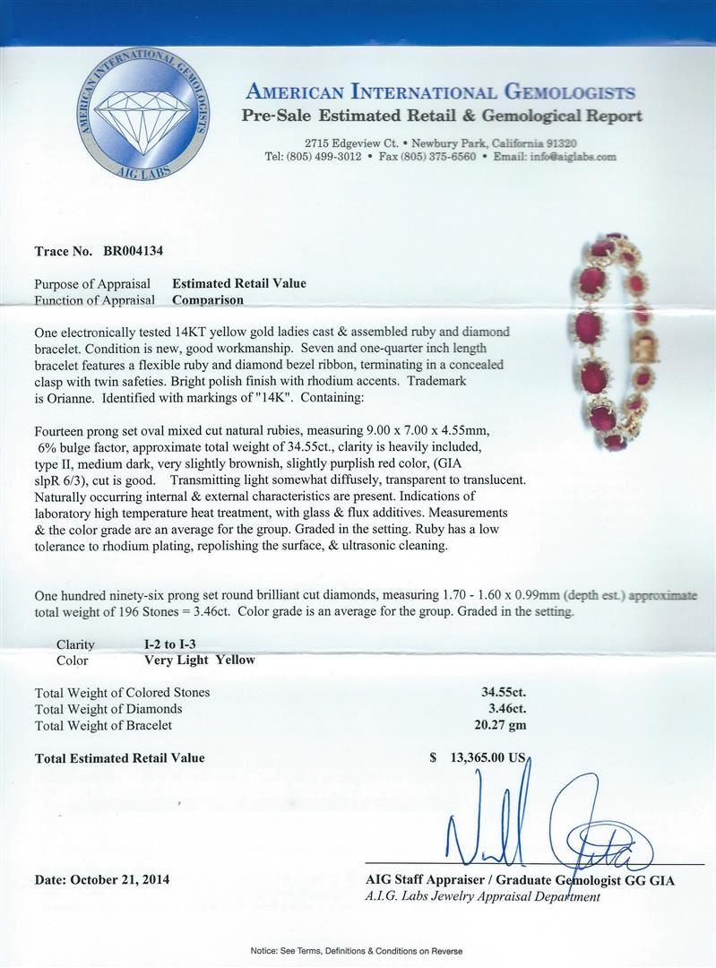 One electronically tested 14KT yellow gold ladies cast & assembled ruby and diamond bracelet. Seven and one-quarter inch length bracelet features a flexible ruby and diamond bezel ribbon, terminating in a concealed clasp with twin safeties. Bright polish finish with rhodium accents. Trademark is Orianne. Identified with markings of "14K". Condition is new, good workmanship. Containing: Fourteen prong set oval mixed cut natural rubies, measuring 9.00 x 7.00 x 4.55mm, 6%. bulge factor, approximate. Total Weight of 34.55ct., clarity is heavily included, type II, medium dark, very slightly brownish, slightly purplish red color, (GIA slpR 6/3), cut is good. Transmitting light somewhat diffusely, transparent to translucent. Naturally occurring internal & external characteristics are present. Indications of laboratory high temperature heat treatment, with glass & flux additives. Measurements& the color grade are an average for the group. Graded in the setting. Ruby has a lowtolerance to rhodium plating, repolishing the surface, & ultrasonic cleaning.One Hundred Ninety-Six prong set round brilliant cut diamonds, measuring 1.70 - 1.60 x 0.99mm (depth est.) approximate. Total Weight of 196 Stones = 3.46ct. Color grade is an average for the group. Graded in the setting. Clarity: I-2 to I-3. Total Weight of Colored Stones 34.55ct. Total Weight of Diamonds 3.46ct. AIG Appraised at $13,365.00.