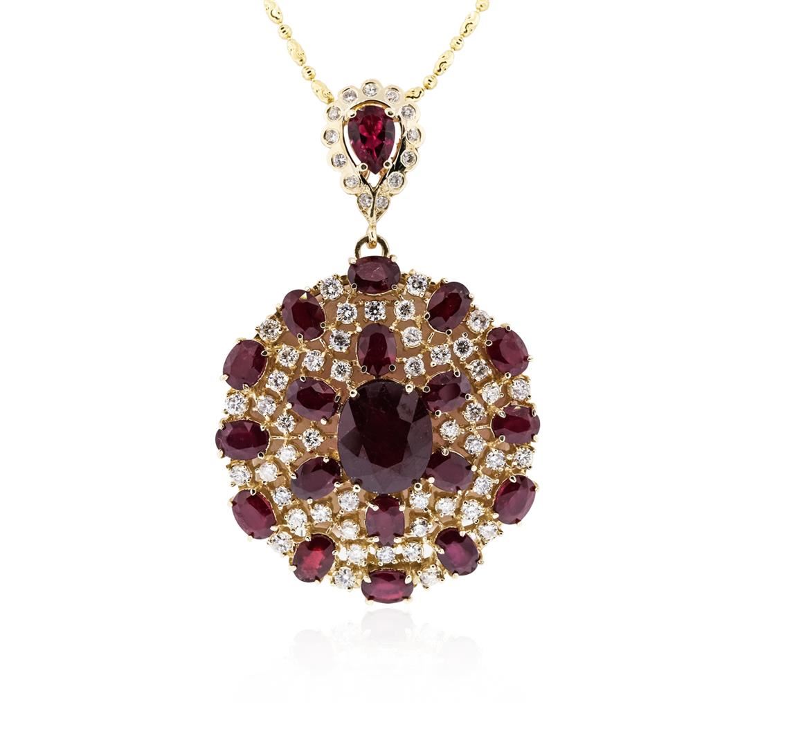 One electronically tested 14KT yellow gold ladies combination cast & assembled ruby and diamond pendant & chain 20.0" long, fancy link with a lobster claw clasp with a bright polish finish. Identified with markings of "14K". Condition is new. Containing: One prong set oval modified brilliant cut natural ruby, measuring 14.71 x 12.60 x 8.19mm, approximate weight of 12.75ct., clarity is heavily included, type II, dark, moderately strong, strongly purplish red color, (GIA stpR 7/4), cut is good. One prong set pear modified brilliant cut natural ruby, measuring 9.17 x 6.25 x 4.06mm, approximate weight of 1.86ct., clarity is moderately included, type II, medium, moderately strong, strongly purplish red color, (GIA stpR 5/4), cut is good. Eighteen prong set oval modified brilliant cut natural rubies, measuring 7.00 x 5.00 x 3.87mm, approximate total weight of 20.52ct., clarity is heavily included, type II, medium dark, moderately strong, strongly purplish red color, (GIA stpR 6/4), cut is good. Forty-Eight prong set round brilliant cut diamonds, measuring 2.80 - 2.80 x 1.68mm (depth est.) approximate total weight of 48 Stones = 3.85ct. Clarity of SI-2 to I-2, Color of K - L, Cut is Good. Twelve prong set round brilliant cut diamonds, measuring 1.50 - 1.50 x 0.90mm (depth est.) approximate total weight of 12 Stones = 0.15ct. Clarity of I-1 to I-2, Color of K - L, Cut is Good. All diamonds and colored gemstones are graded in the mounting, unless otherwise stated. Colored gemstones are presumed to have been subjected to commonly used enhancement processes. Total Weight of Colored Stones 35.13 ct. Total Weight of Diamonds 4.00 ct. Total Weight of Pendant & Chain 34.00 grams. GGL Appraised at $19,190.00.
