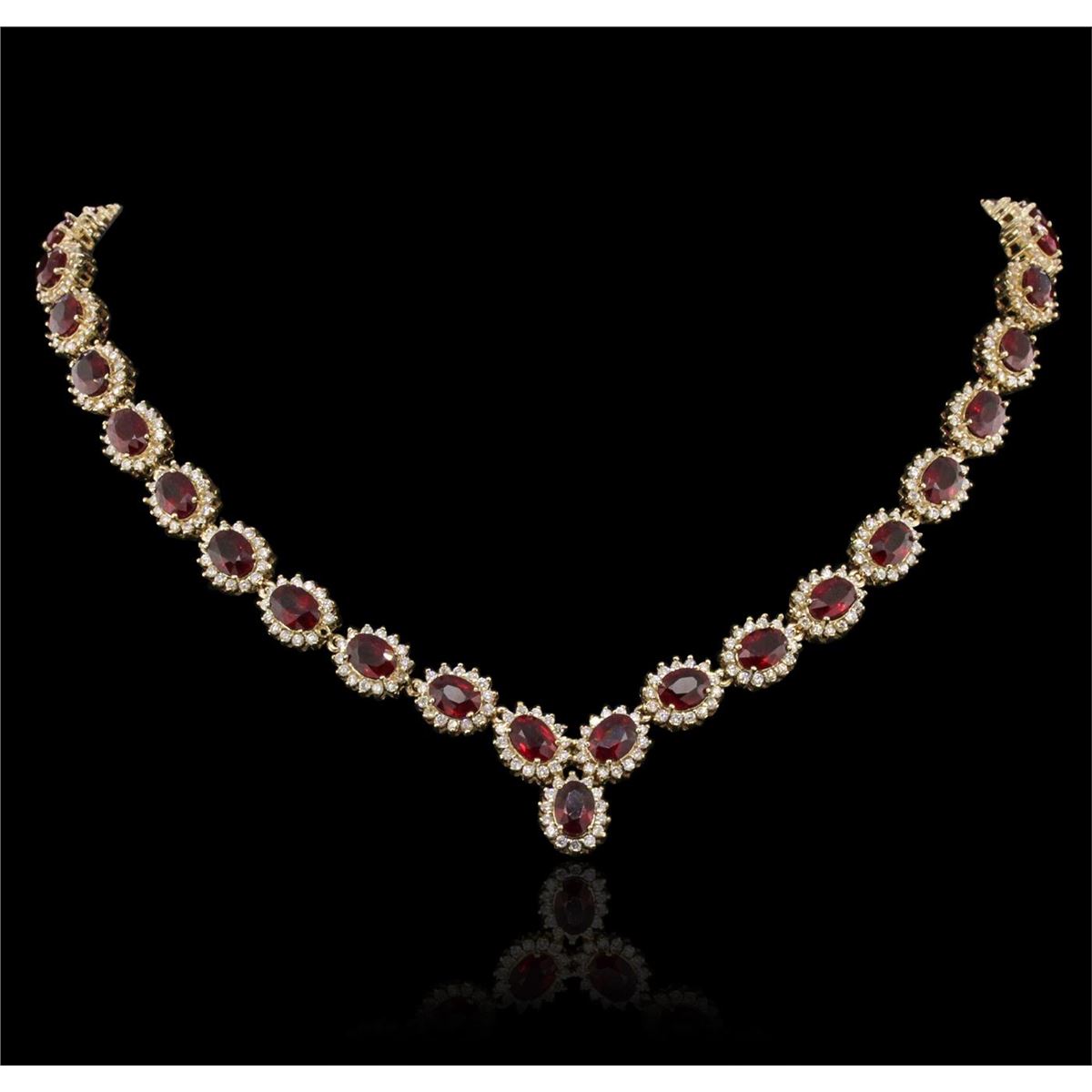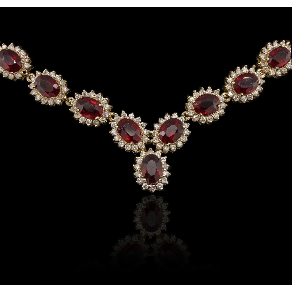 One electronically tested 14KT yellow gold ladies combination cast & assembled necklace with a hidden box clasp with a bright polish finish. Condition is new. Measurements: 15.85" in length. Identified with markings of "14K". Containing: Thirty-seven prong set oval modified brilliant cut natural rubies, measuring 6.84 x 4.90 x 3.50mm, approximate. Total Weight of 35.52ct., clarity is heavily included, type II, medium dark, moderately strong, strongly purplish red color, (GIA stpR 6/4), cut is good. Five Hundred Eighteen prong set round brilliant cut diamonds, measuring 1.40 - 1.40 x 0.84mm (depth est.) approximate. Total Weight of 518 Stones = 5.18ct. Clarity: I-1 to I-2. Color: J - K, Cut is Good. Colored gemstones are presumed to have been subjected to commonly used enhancement processes. All diamonds and colored gemstones are graded in the mounting, unless otherwise stated. Total Weight of Colored Stones 35.52ct. Total Weight of Diamonds 5.18ct. Total Weight of Necklace 48.60 grams. GGL Appraised at $38,190.00.