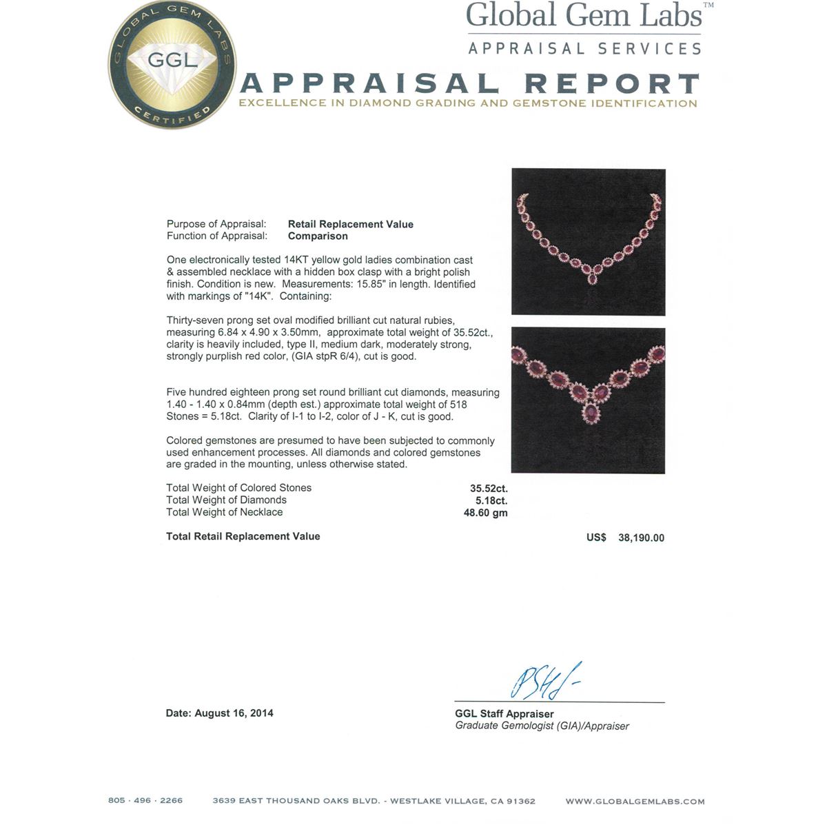 One electronically tested 14KT yellow gold ladies combination cast & assembled necklace with a hidden box clasp with a bright polish finish. Condition is new. Measurements: 15.85" in length. Identified with markings of "14K". Containing: Thirty-seven prong set oval modified brilliant cut natural rubies, measuring 6.84 x 4.90 x 3.50mm, approximate. Total Weight of 35.52ct., clarity is heavily included, type II, medium dark, moderately strong, strongly purplish red color, (GIA stpR 6/4), cut is good. Five Hundred Eighteen prong set round brilliant cut diamonds, measuring 1.40 - 1.40 x 0.84mm (depth est.) approximate. Total Weight of 518 Stones = 5.18ct. Clarity: I-1 to I-2. Color: J - K, Cut is Good. Colored gemstones are presumed to have been subjected to commonly used enhancement processes. All diamonds and colored gemstones are graded in the mounting, unless otherwise stated. Total Weight of Colored Stones 35.52ct. Total Weight of Diamonds 5.18ct. Total Weight of Necklace 48.60 grams. GGL Appraised at $38,190.00.