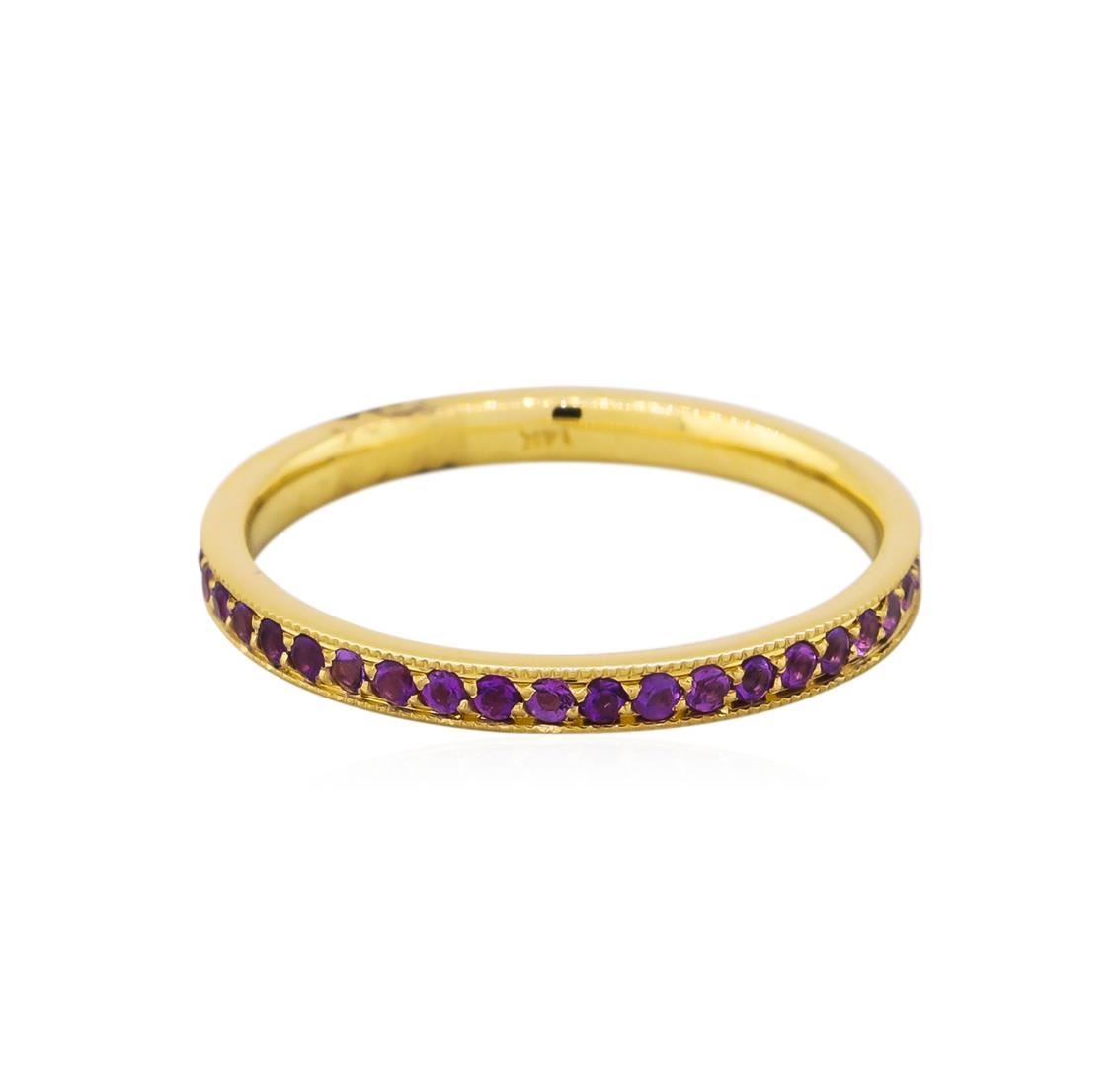 This ring is made of 14KT Yellow Gold weighing approximately 1.05 grams with markings of "14K" on the inside of the band. There is approximately 0.36ctw of round cut Amethyst set within the band. The ring is a size 6.