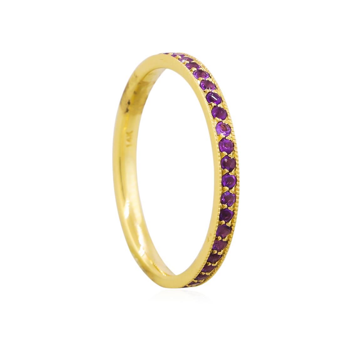 This ring is made of 14KT Yellow Gold weighing approximately 1.05 grams with markings of "14K" on the inside of the band. There is approximately 0.36ctw of round cut Amethyst set within the band. The ring is a size 6.
