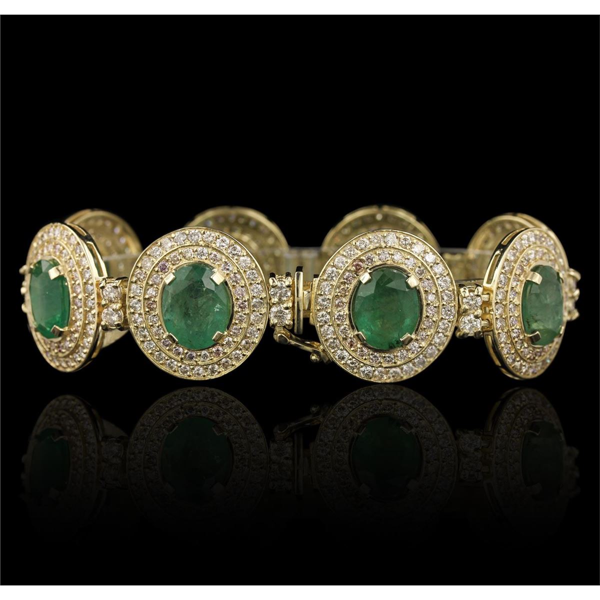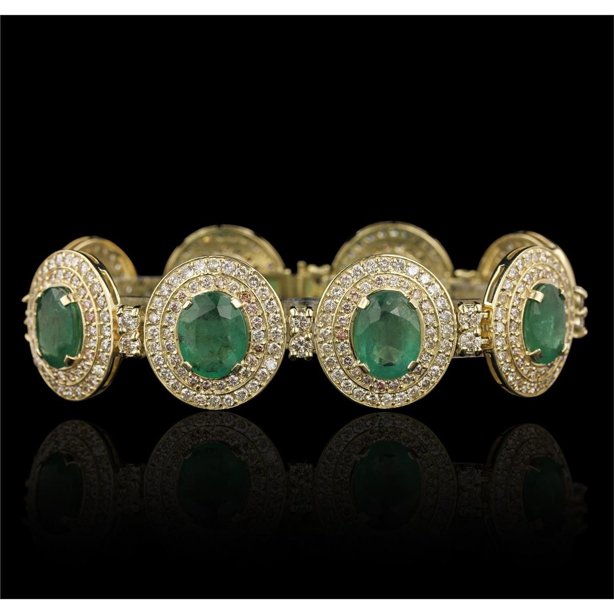 One electronically tested 14KT yellow Ladies combination cast & assembled bracelet with a hidden box clasp with a bright polish finish. Measurements: 8" in length. Identified with markings of "14K". Condition is excellent. Containing: Eight prong set oval modified brilliant cut natural emeralds, measuring 12.70 x 9.80 x 6.75mm, approximate total weight of 37.20ct., clarity is heavily included, type III, medium light, very slightly grayish, very slightly bluish green color, (GIA vslbG 4/3), cut is good. Colored gemstones are presumed to have been subjected to commonly used and possible undetectable color/clarity enhancement processes. Four Hundred Eight bead set round brilliant cut diamonds, measuring 2.00 - 1.90 x 1.17mm (depth est.) approximate total weight of 408 Stones = 11.06ct. Clarity of I-1 to I-3, Color of L - M, Cut is Good. Sixteen prong set round brilliant cut diamonds, measuring 3.10 - 3.10 x 1.86mm (depth est.) approximate total weight of 16 Stones = 1.74ct. Clarity of I-1 to I-2, Color of L - M, Cut is Good. Total Weight of Colored Stones 37.20ct. Total Weight of Diamonds 12.80ct. Total Weight of Bracelet 55.10gm. GGL Appraised at $57,060.00.