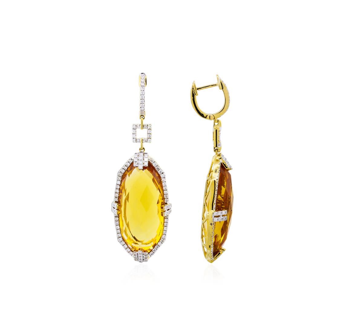 Glamorous art deco style citrine and diamond dangle earrings feature two large citrine center stones totalling 37.46 carats intricately framed by one hundred and ninety-eight round diamonds totaling 1.24 carats. Total weight of earrings is 9.21 grams. Design is meant for pierced ears.