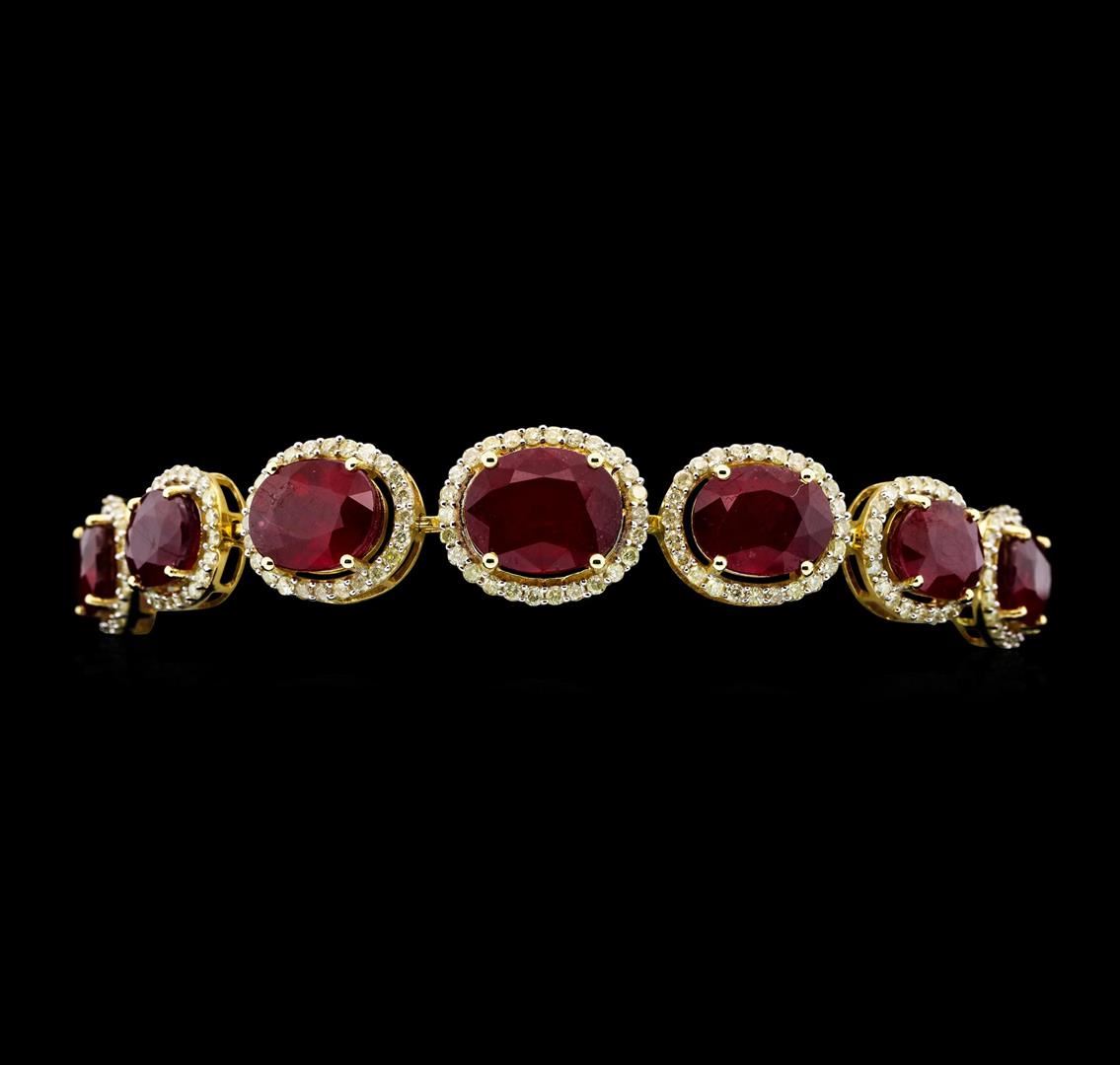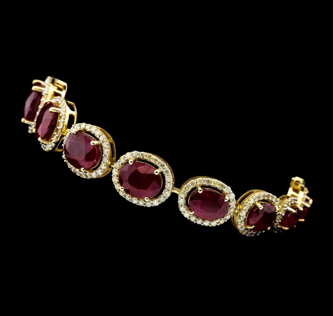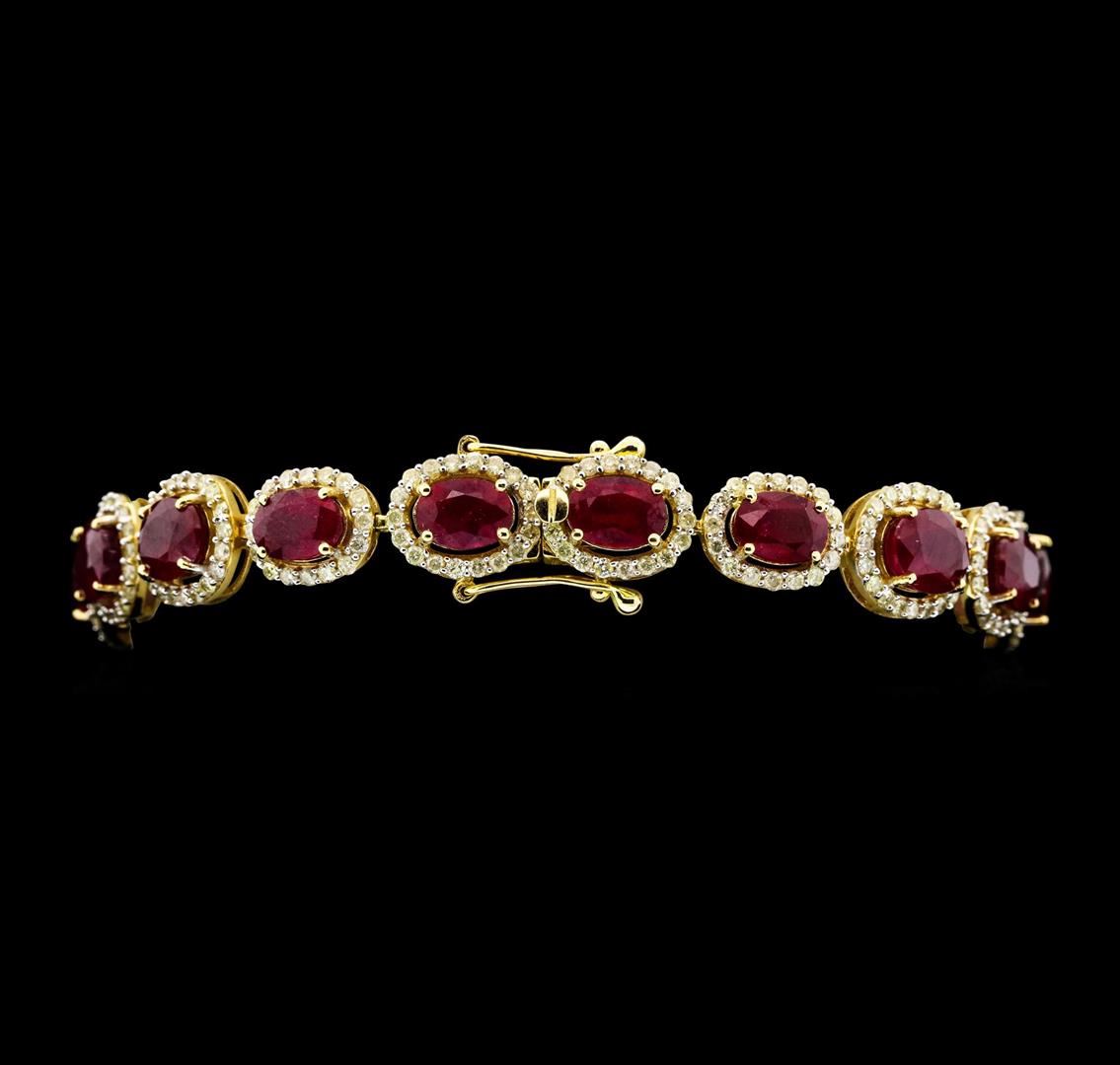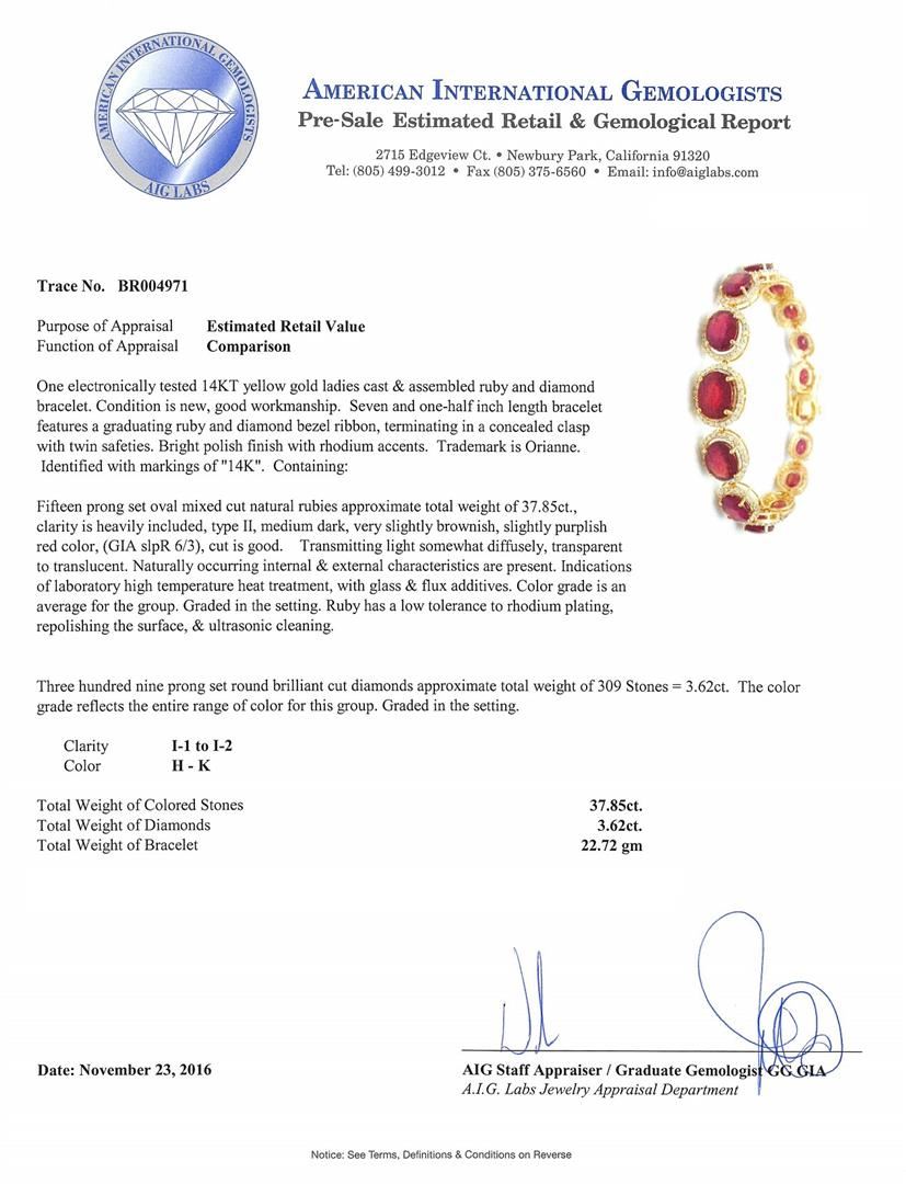One electronically tested 14KT yellow gold ladies cast & assembled ruby and diamond bracelet. Seven and one-half inch length bracelet features a graduating ruby and diamond bezel ribbon, terminating in a concealed clasp with twin safeties. Bright polish finish with rhodium accents. Trademark is Orianne. Identified with markings of "14K". Condition is new, good workmanship. Containing: Fifteen prong set oval mixed cut natural rubies approximate total weight of 37.85ct., clarity is heavily included, type II, medium dark, very slightly brownish, slightly purplish red color, (GIA slpR 6/3), cut is good. Transmitting light somewhat diffusely, transparent to translucent. Naturally occurring internal & external characteristics are present. Indicationsof laboratory high temperature heat treatment, with glass & flux additives. Color grade is anaverage for the group. Graded in the setting. Ruby has a low tolerance to rhodium plating,repolishing the surface, & ultrasonic cleaning.Three Hundred Nine prong set round brilliant cut diamonds approximate total weight of 309 Stones = 3.62ct. The color grade reflects the entire range of color for this group. Graded in the setting. Clarity: I-1 to I-2. Color: H - K. Total Weight of Colored Stones 37.85ct. Total Weight of Diamonds 3.62ct. Total Weight of Bracelet 22.72gm. AIG Appraised.
