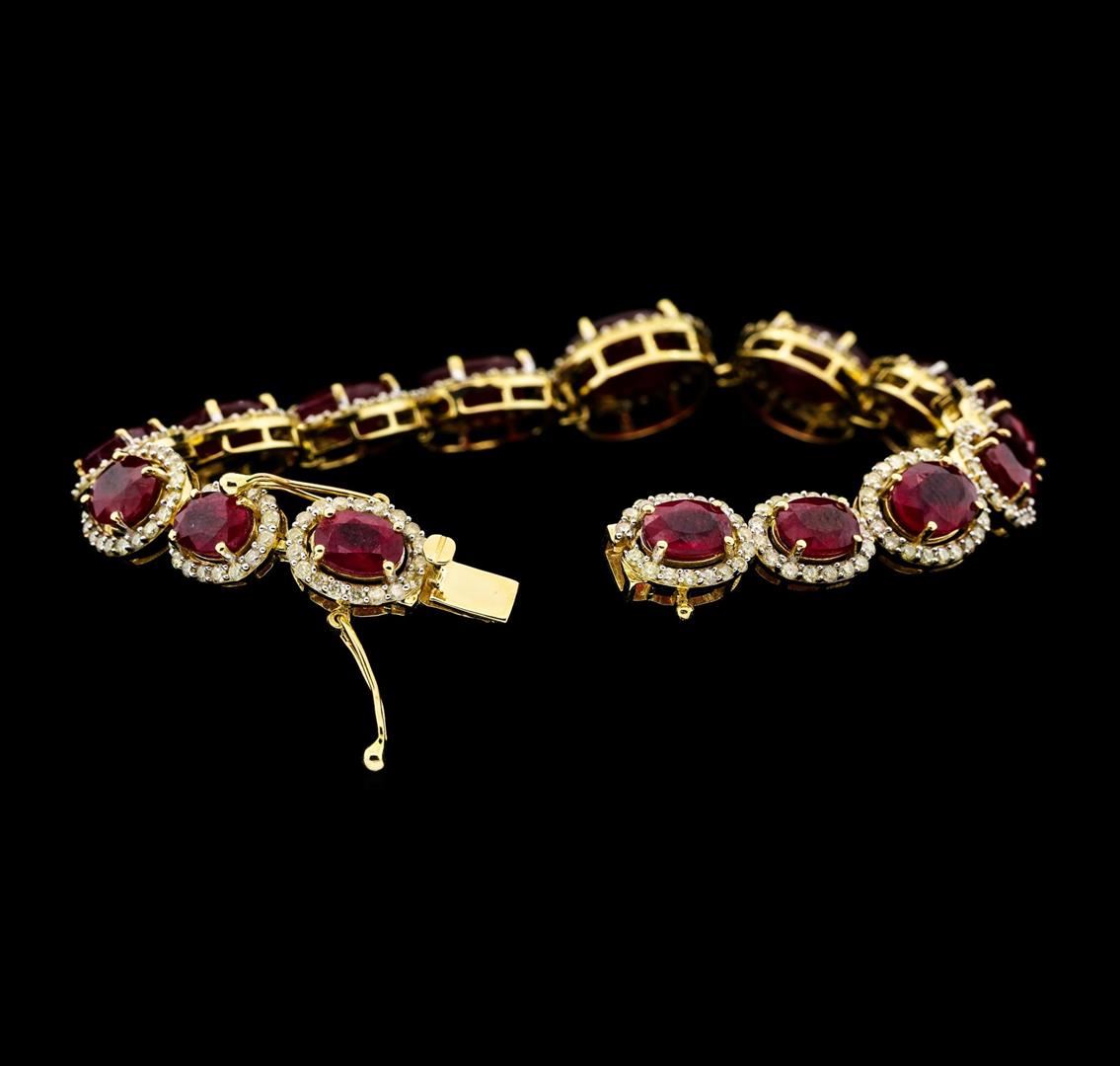 One electronically tested 14KT yellow gold ladies cast & assembled ruby and diamond bracelet. Seven and one-half inch length bracelet features a graduating ruby and diamond bezel ribbon, terminating in a concealed clasp with twin safeties. Bright polish finish with rhodium accents. Trademark is Orianne. Identified with markings of "14K". Condition is new, good workmanship. Containing: Fifteen prong set oval mixed cut natural rubies approximate total weight of 37.85ct., clarity is heavily included, type II, medium dark, very slightly brownish, slightly purplish red color, (GIA slpR 6/3), cut is good. Transmitting light somewhat diffusely, transparent to translucent. Naturally occurring internal & external characteristics are present. Indicationsof laboratory high temperature heat treatment, with glass & flux additives. Color grade is anaverage for the group. Graded in the setting. Ruby has a low tolerance to rhodium plating,repolishing the surface, & ultrasonic cleaning.Three Hundred Nine prong set round brilliant cut diamonds approximate total weight of 309 Stones = 3.62ct. The color grade reflects the entire range of color for this group. Graded in the setting. Clarity: I-1 to I-2. Color: H - K. Total Weight of Colored Stones 37.85ct. Total Weight of Diamonds 3.62ct. Total Weight of Bracelet 22.72gm. AIG Appraised.