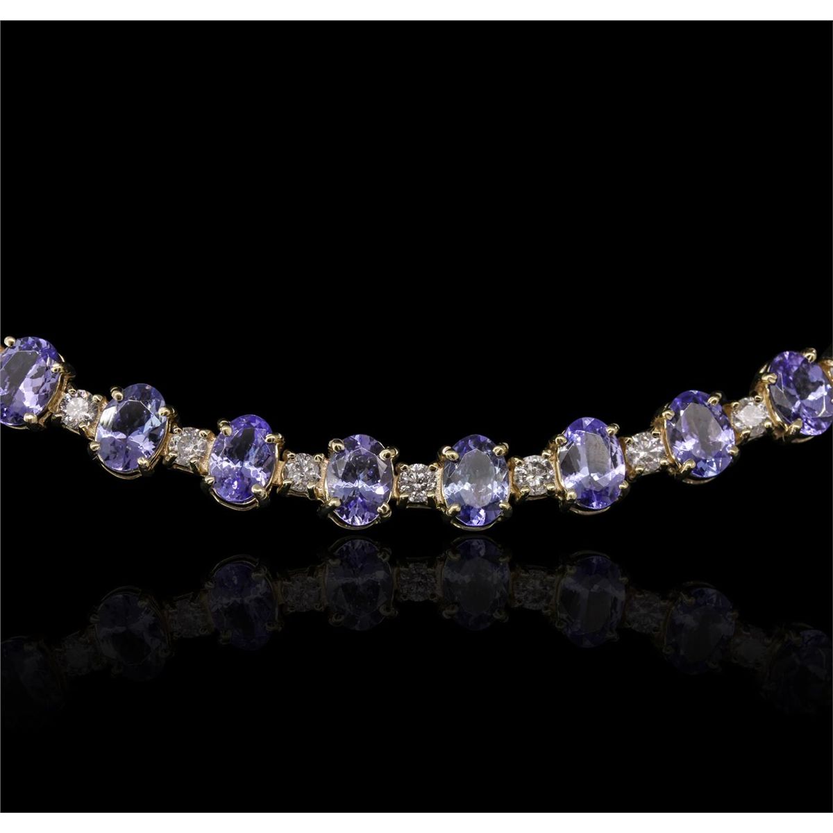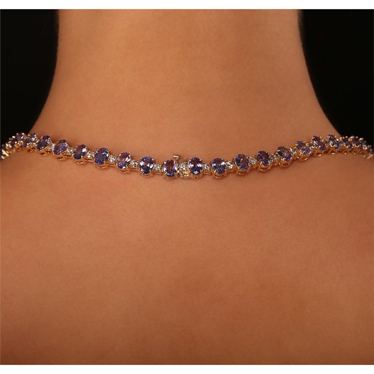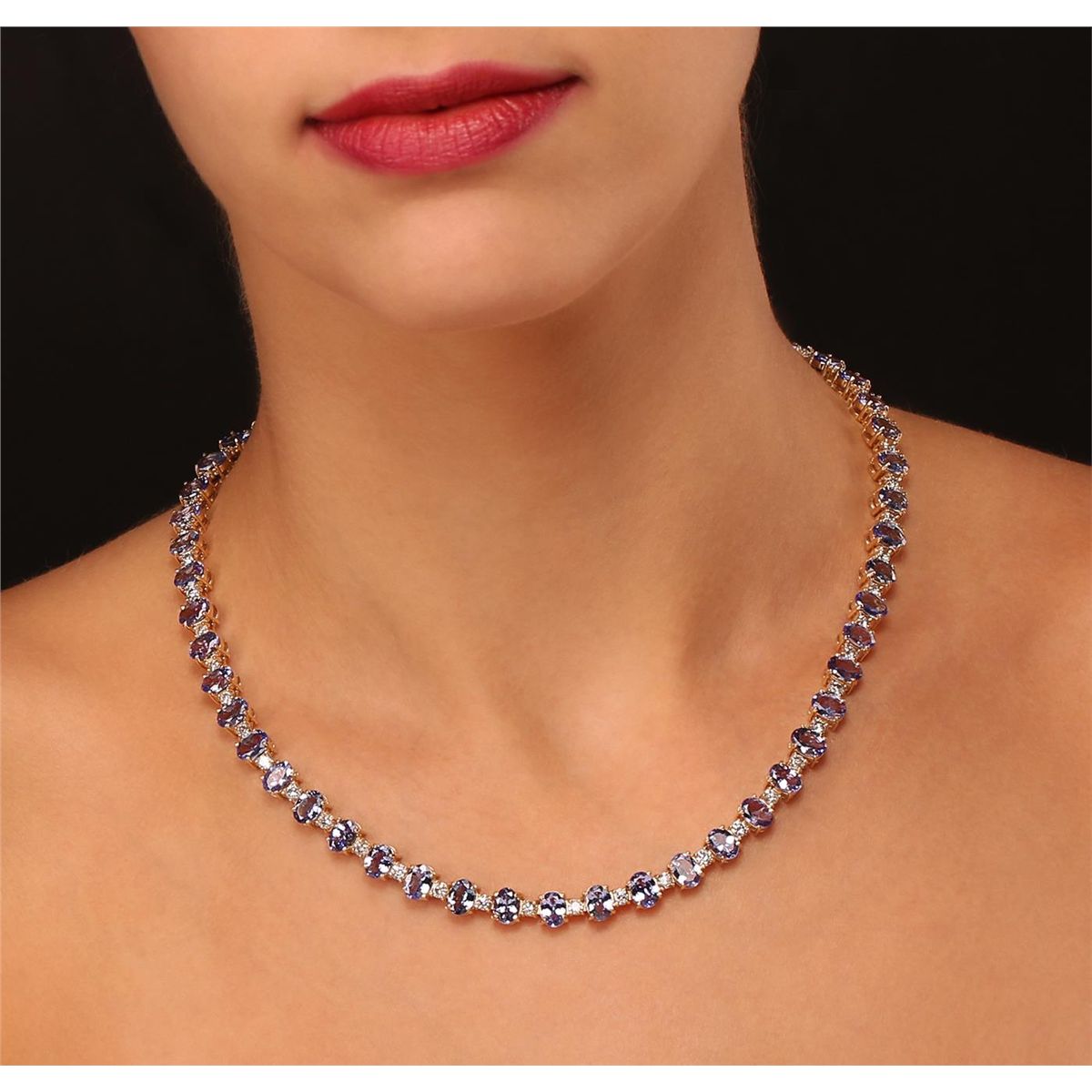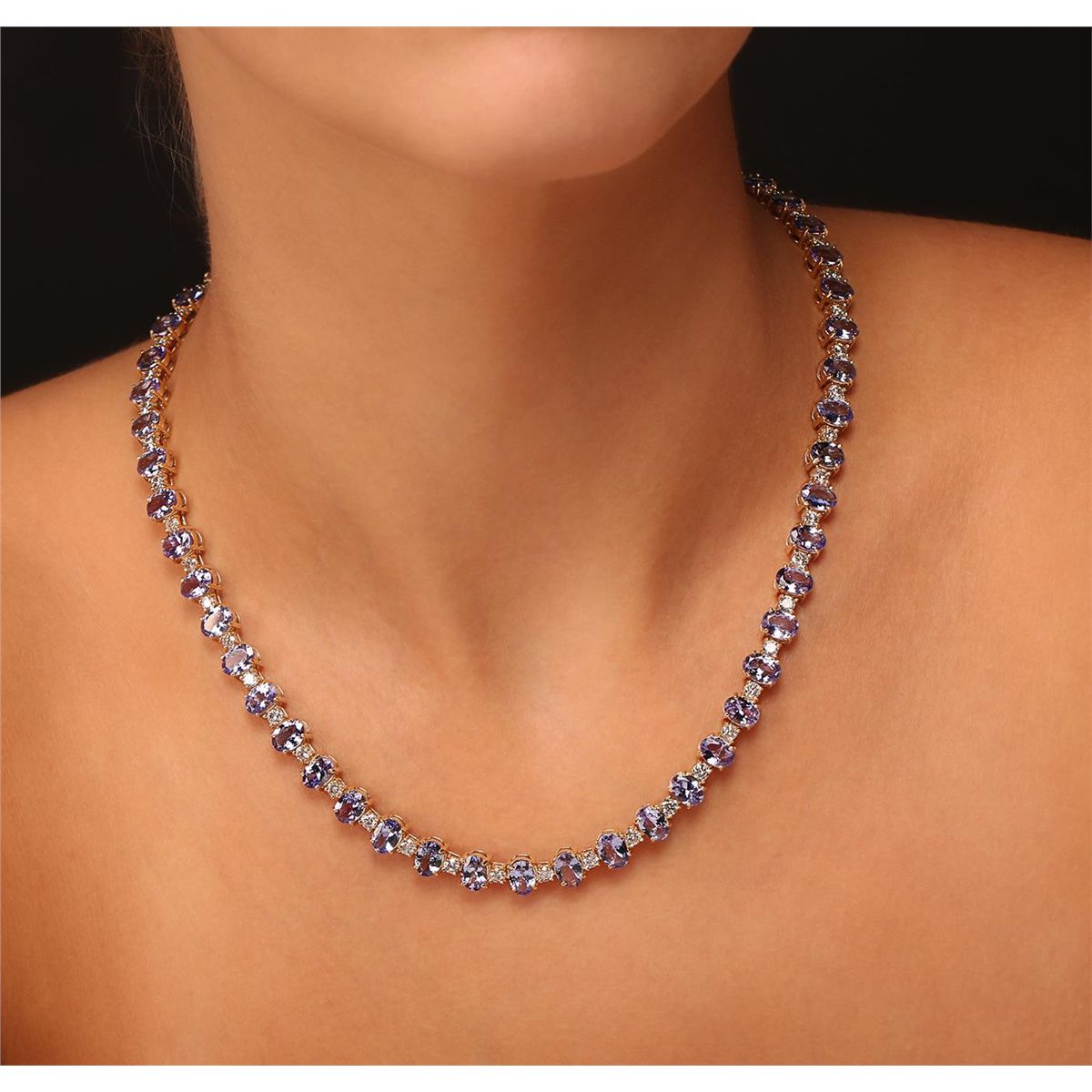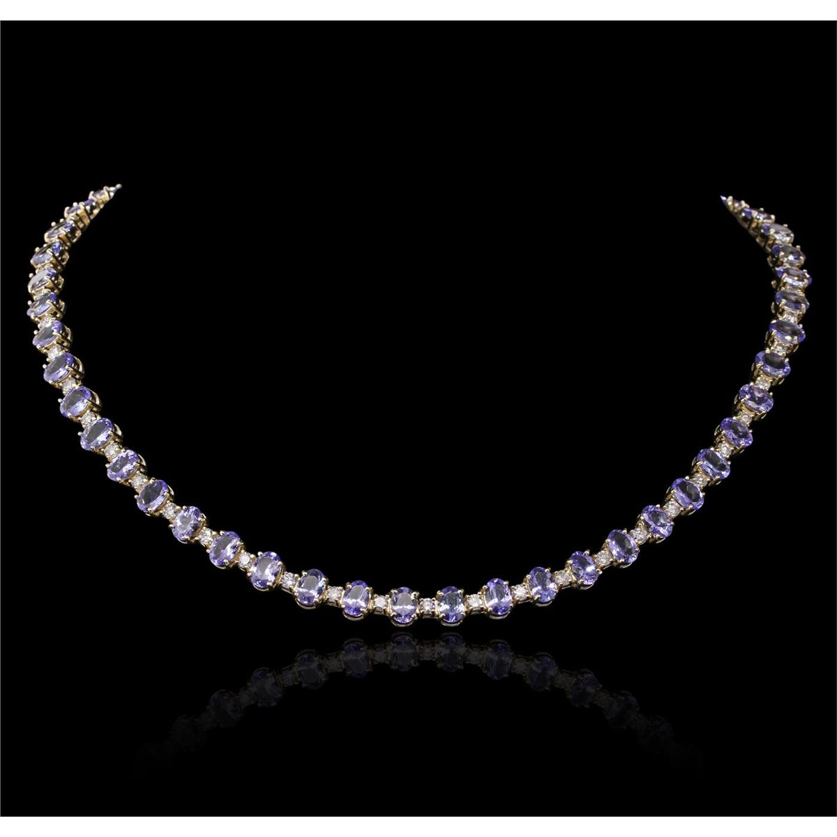 One electronically tested 14KT yellow gold Ladies combination cast & assembled necklace with a hidden box clasp with a bright polish finish. Condition is new. Measurements: 17.75" in length. Identified with markings of "14K". Containing: Fifty-two prong set oval modified brilliant cut natural tanzanites, measuring 6.86 x 4.90 x 2.70mm, approximate. Total Weight of 38.71ct., clarity is eye clean, type I, medium light, very slightly grayish, violet color, (GIA V 4/3), cut is very good. Colored gemstones are presumed to have been subjected to commonly used color/clarity enhancement processes. Fifty-Two prong set round brilliant cut diamonds, measuring 3.00 - 3.00 x 1.80mm (depth est.) approximate. Total Weight of 52 Stones = 5.62ct. Clarity: I-2 to I-3. Color: H - I, Cut is Good. Total Weight of Colored Stones 38.71ct. Total Weight of Diamonds 5.62ct. Total Weight of Necklace 44.90 grams. GGL Appraised at $54,970.00.