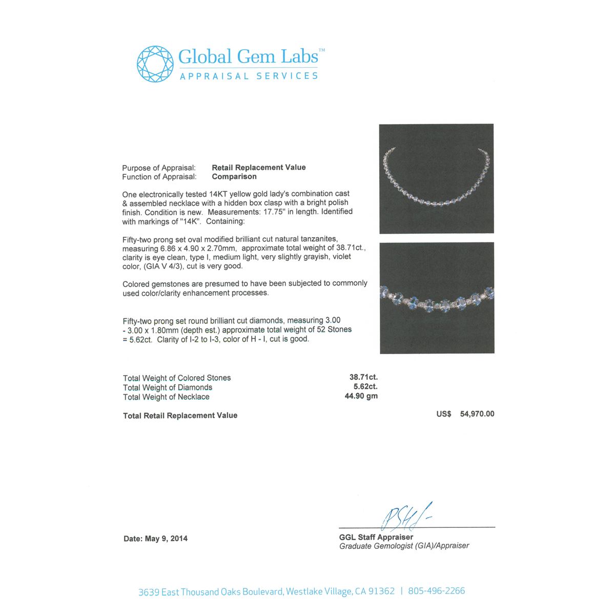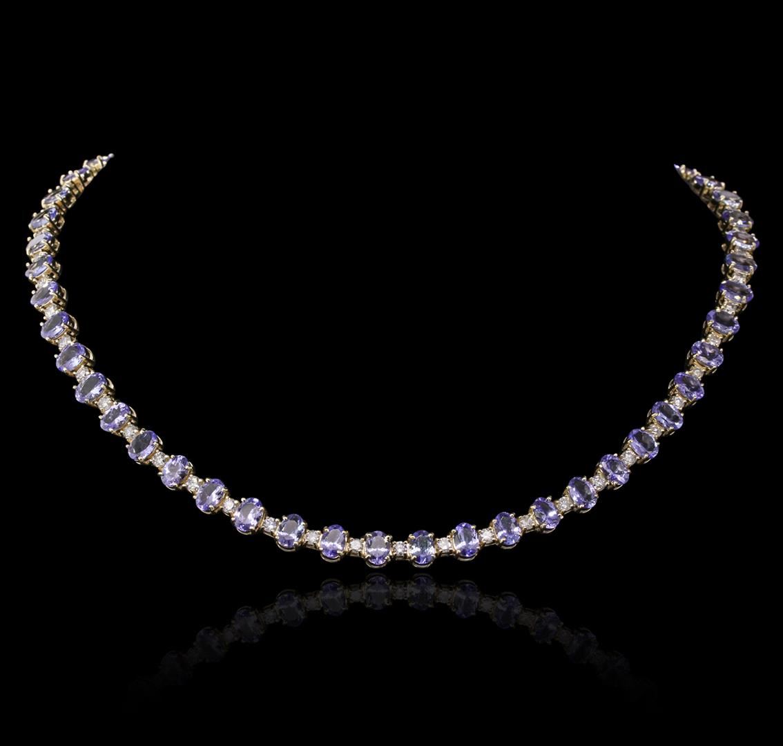 One electronically tested 14KT yellow gold Ladies combination cast & assembled necklace with a hidden box clasp with a bright polish finish. Condition is new. Measurements: 17.75" in length. Identified with markings of "14K". Containing: Fifty-two prong set oval modified brilliant cut natural tanzanites, measuring 6.86 x 4.90 x 2.70mm, approximate. Total Weight of 38.71ct., clarity is eye clean, type I, medium light, very slightly grayish, violet color, (GIA V 4/3), cut is very good. Colored gemstones are presumed to have been subjected to commonly used color/clarity enhancement processes. Fifty-Two prong set round brilliant cut diamonds, measuring 3.00 - 3.00 x 1.80mm (depth est.) approximate. Total Weight of 52 Stones = 5.62ct. Clarity: I-2 to I-3. Color: H - I, Cut is Good. Total Weight of Colored Stones 38.71ct. Total Weight of Diamonds 5.62ct. Total Weight of Necklace 44.90 grams. GGL Appraised at $54,970.00.