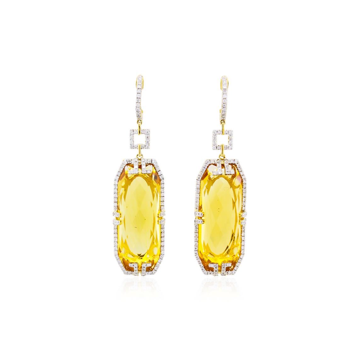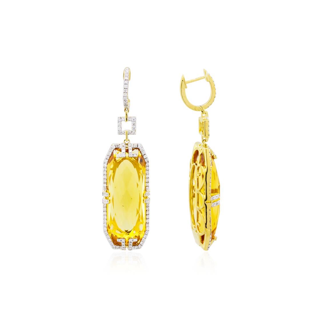 Glamorous art deco style citrine and diamond dangle earrings feature two large citrine center stones totalling 38.96 carats intricately framed by two hundred and forteen round diamonds totaling 1.00 carat. Total weight of earrings is 9.35 grams. Design is meant for pierced ears.