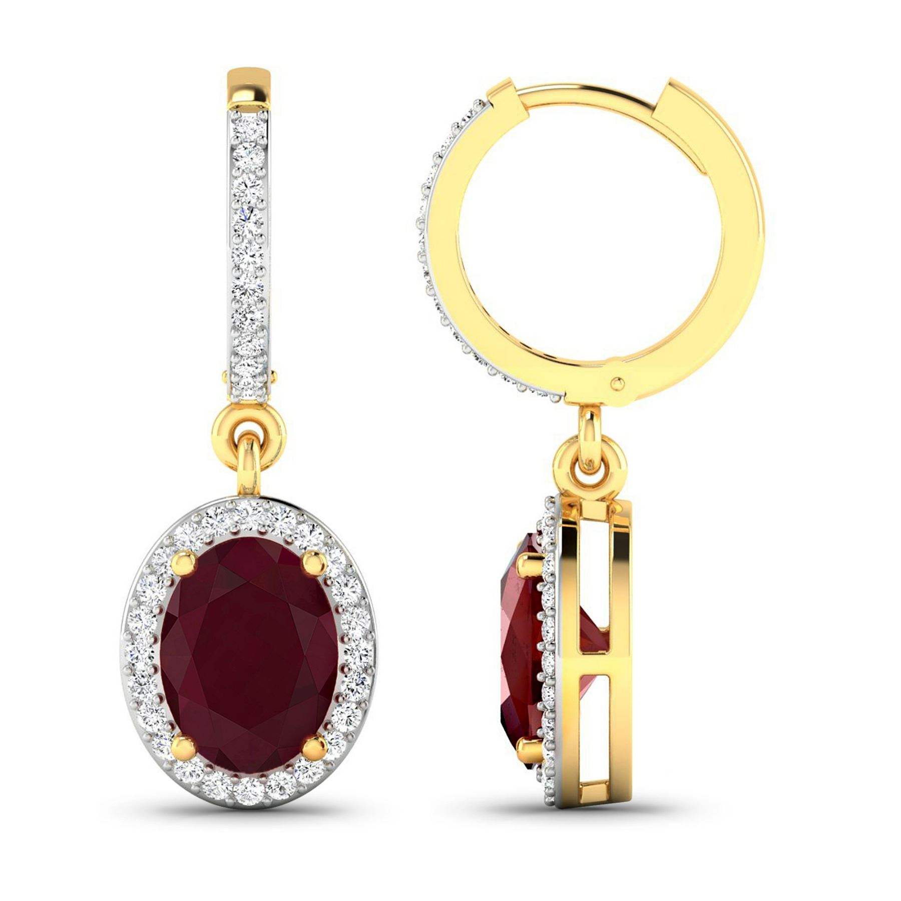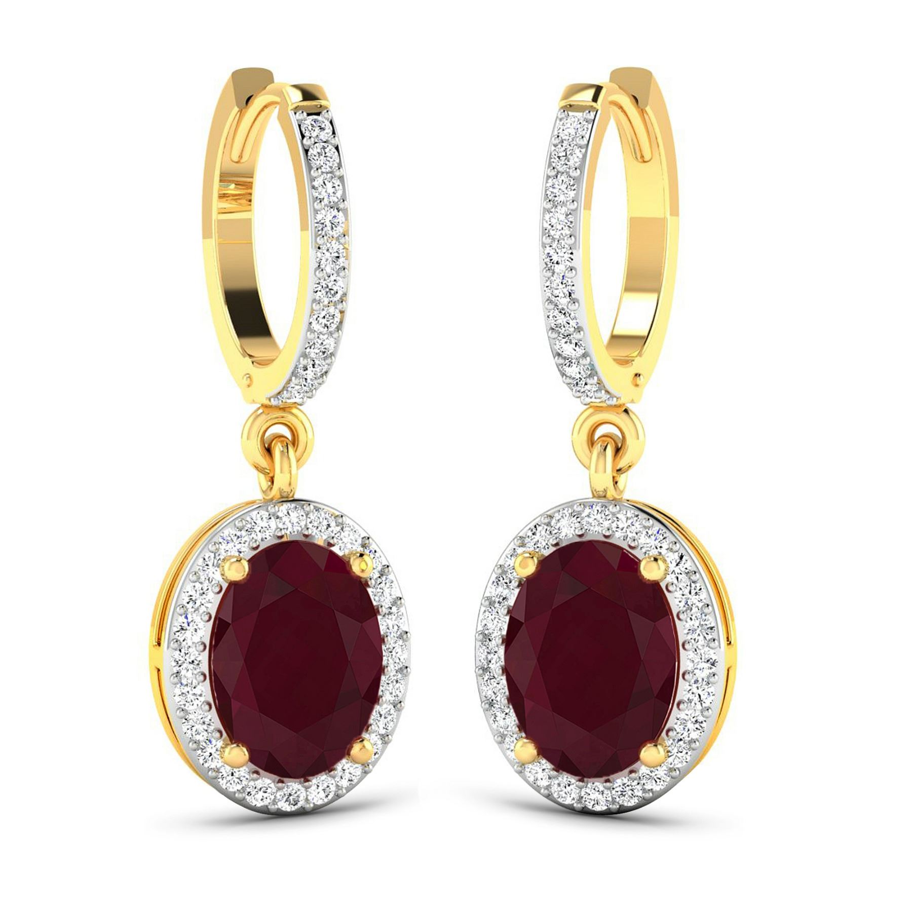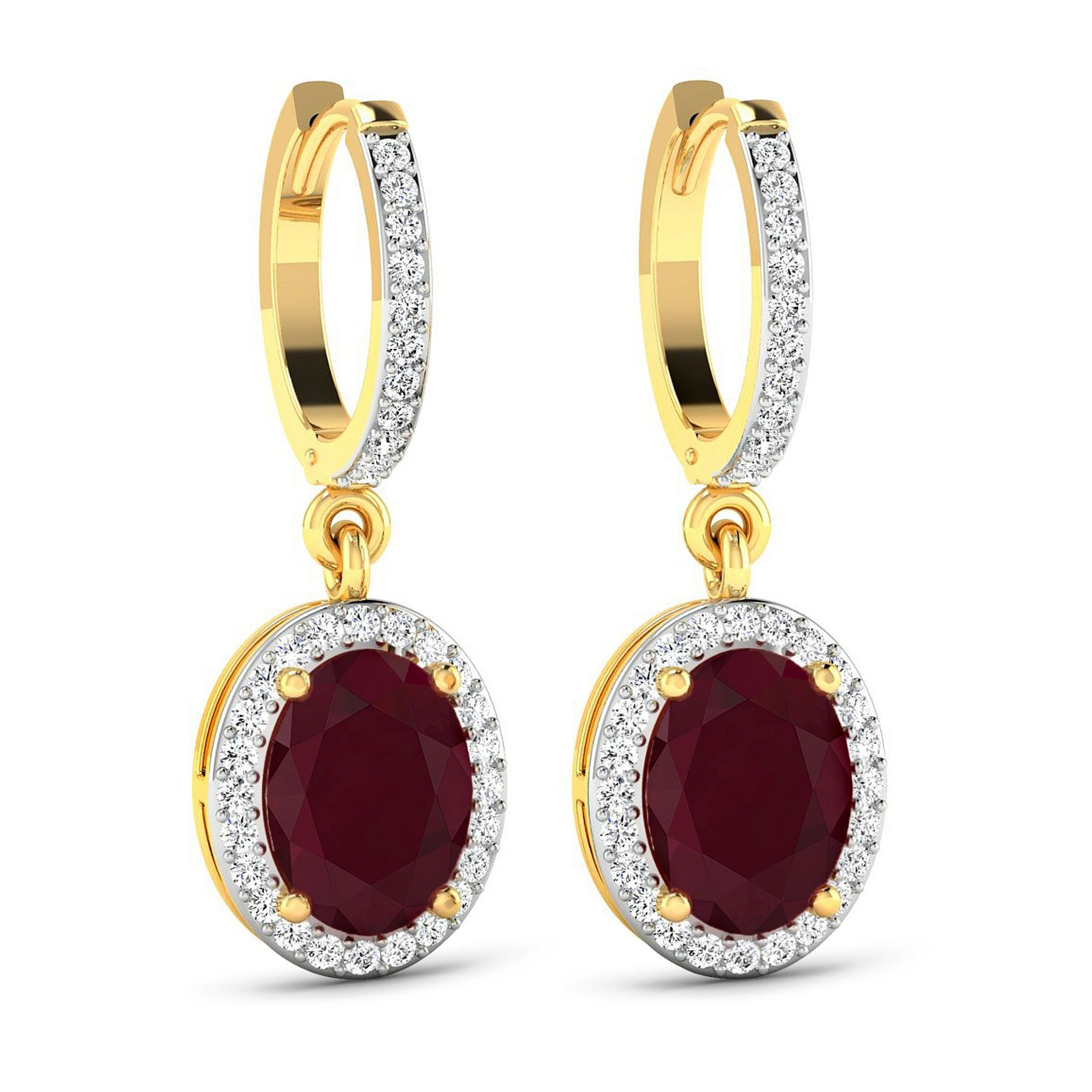 Ruby (AA) Oval 8x6mm - 2Pcs + White Diamond F/C Round 1.00mm - 70Pcs ( Clip On ) ( White Pan Rhodium ) ( I1-I2/I color ) Total weight of gemstones is 3cts. Total Diamond weight is 0.32cts. Total weight of these earrings are 3.44 grams.