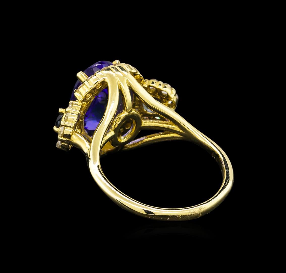 One electronically tested 14KT yellow gold Ladies combination cast & assembled ring with a bright polish finish. Condition is new. Containing: One prong set oval modified brilliant cut natural tanzanite, measuring 11.66 x 8.15 x 6.10mm, approximate weight of 4.01ct., clarity is eye clean, type I, medium, moderately strong, bluish violet color, (GIA bV 5/4), cut is very good. Two prong set round modified brilliant cut natural blue sapphires, measuring 3.10 - 3.10 x 2.02 mm, approximate. Total Weight of 0.32ct., clarity is heavily included, type II, medium dark, moderately strong, blue color, (GIA B 6/4), cut is good. Colored gemstones are presumed to have been subjected to commonly used color/clarity enhancement processes. Thirty prong set round brilliant cut diamonds, measuring 1.70 - 1.70 x 1.02mm (depth est.) approximate. Total Weight of 30 Stones = 0.54ct. Clarity: I-1 to I-3. Color: I - J, Cut is Good. Total Weight of Colored Stones 4.33ct. Total Weight of Diamonds 0.54ct. Total Weight of Ring 6.20 grams. GGL Appraised at $7,280.00.