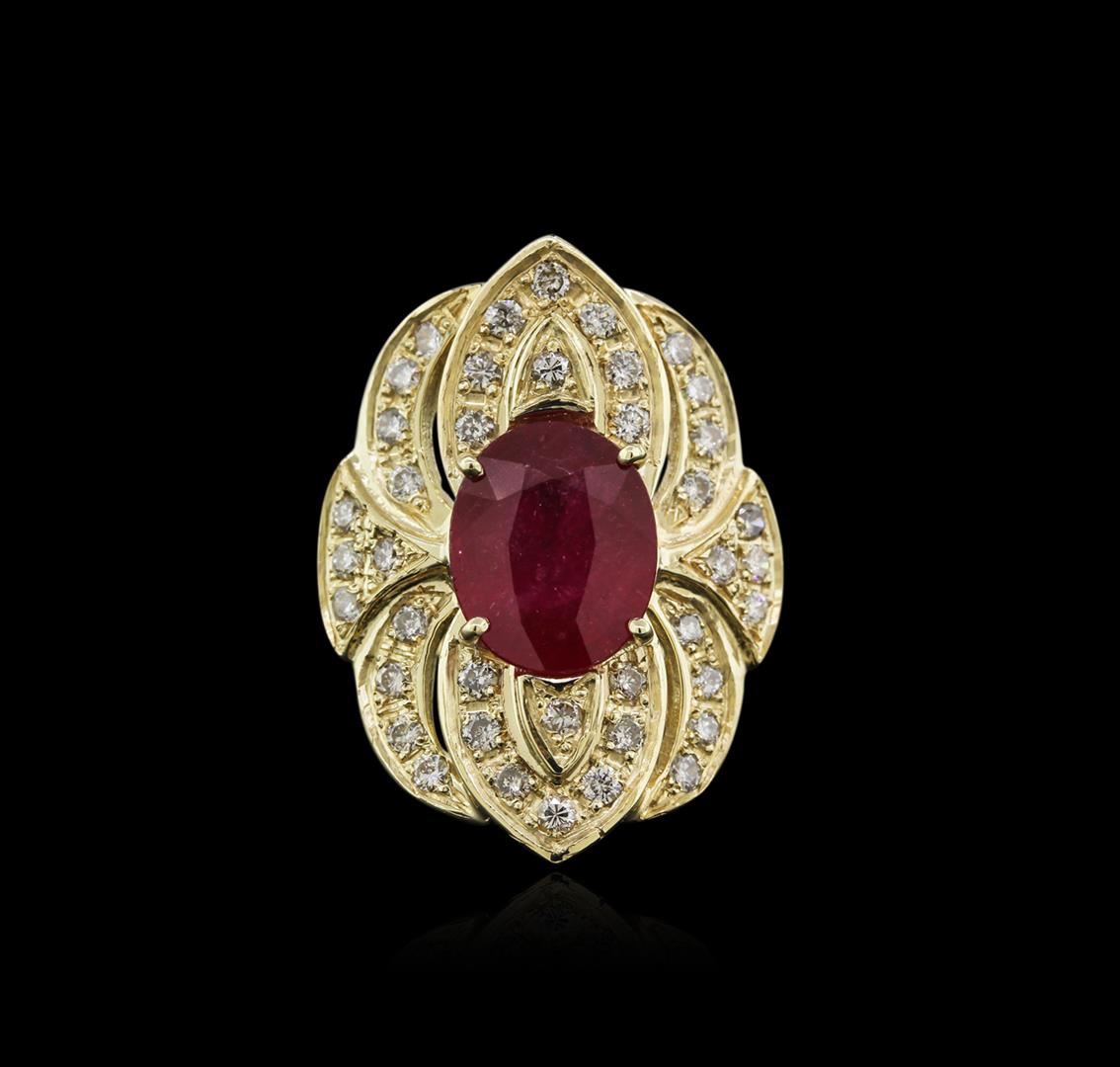 One electronically tested 14KT yellow gold ladies cast ruby and diamond ring with a bright polish finish. Identified with markings of "14K". Condition is new. Containing: One prong set oval modified brilliant cut natural ruby, measuring 11.00 x 9.10 x 4.83mm, approximate weight of 4.06ct., clarity is heavily included, type II, medium dark, very slightly brownish, strongly purplish red color, (GIA stpR 6/3), cut is good. Forty prong set round brilliant cut diamonds, measuring 1.50 - 1.50 x 0.90mm (depth est.) approximate total weight of 40 Stones = 0.49ct. Clarity: SI-1 to SI-2. Color: I - J, Cut is Good. All diamonds and colored gemstones are graded in the mounting, unless otherwise stated. Colored gemstones are presumed to have been subjected to commonly used enhancement processes. Total Weight of Colored Stones 4.06ct. Total Weight of Diamonds 0.49ct. Total Weight of Ring 9.60 grams. GGL Appraised at $3,250.00.