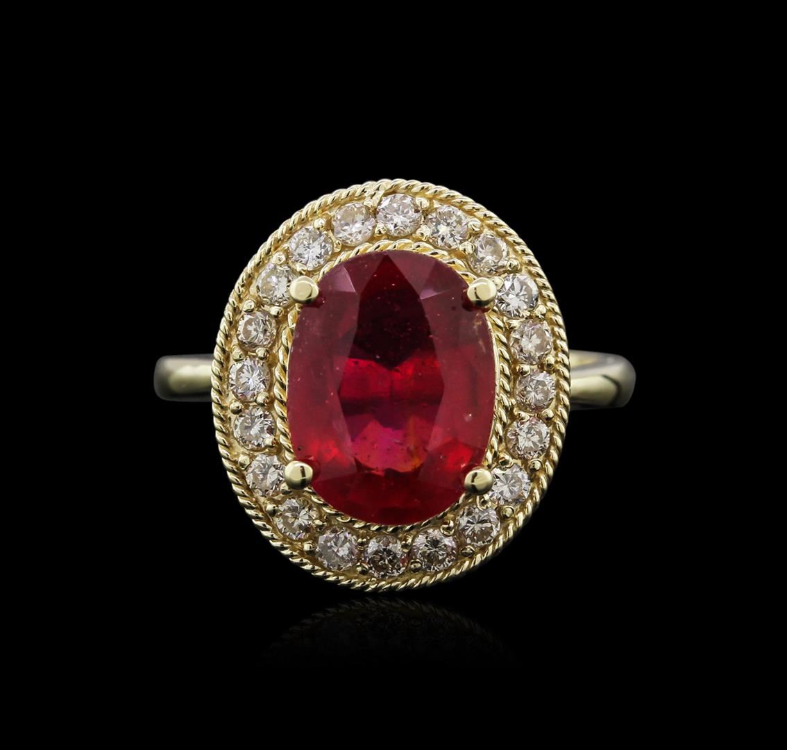 One electronically tested 14KT yellow gold ladies cast ruby and diamond ring with a bright polish finish. Identified with markings of "K14". Condition is new. Containing: One prong set oval modified brilliant cut natural ruby, measuring 11.29 x 8.61 x 4.98mm, approximate weight of 4.07ct., clarity is heavily included, type II, medium dark, moderately strong, strongly purplish red color, (GIA stpR 6/4), cut is good. Twenty prong set round brilliant cut diamonds, measuring 1.70 - 1.70 x 1.02mm (depth est.) approximate total weight of 20 Stones = 0.36ct. Clarity: I-1 to I-2. Color: L - M, Cut is Good. Diamonds and colored gemstones are graded in the mounting, unless otherwise stated. Colored gemstones are presumed to have been subjected to commonly used enhancement processes. Total Weight of Colored Stones 4.07ct. Total Weight of Diamonds 0.36ct. Total Weight of Ring 5.70 grams. GGL Appraised at $2,635.00.