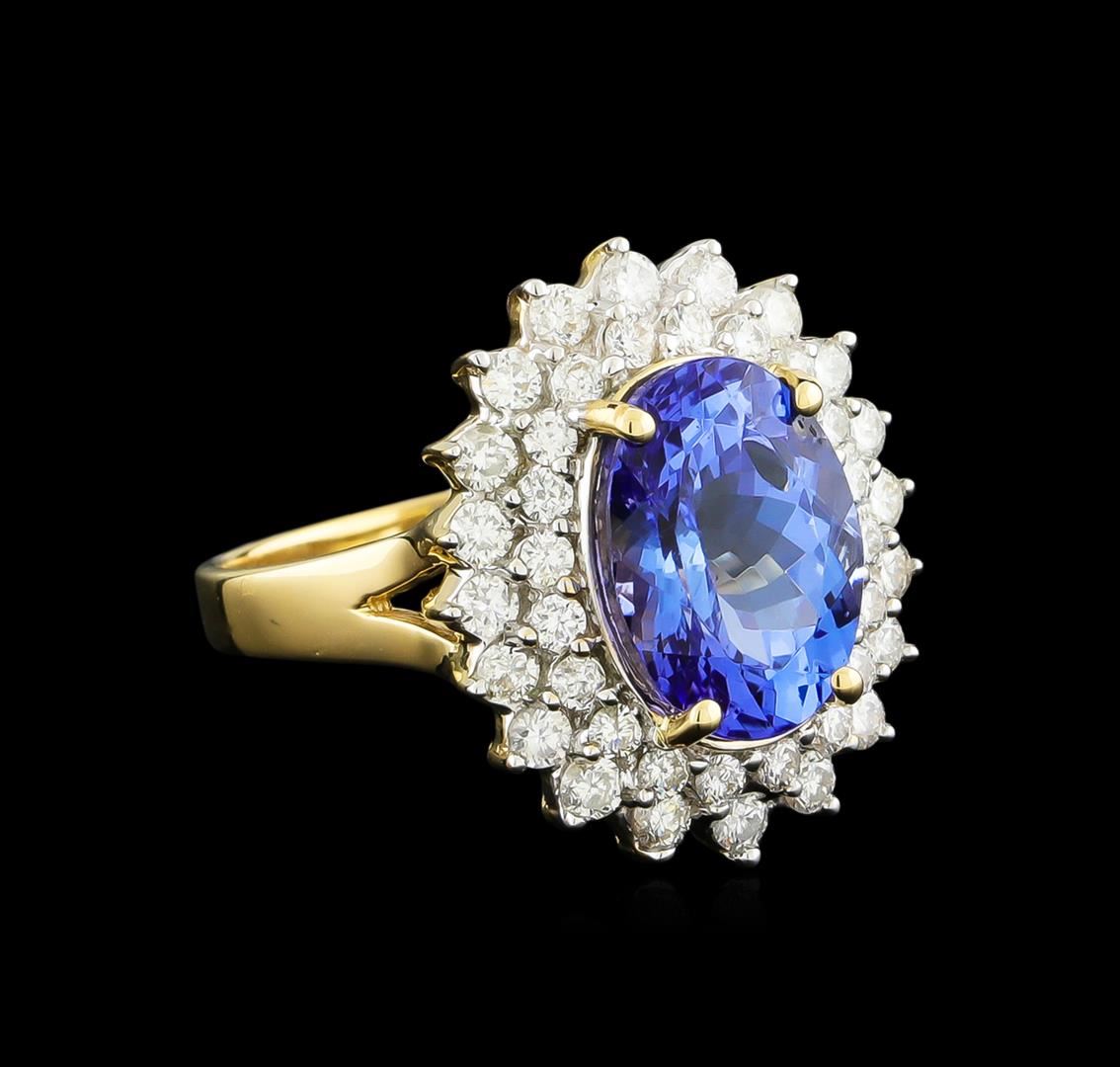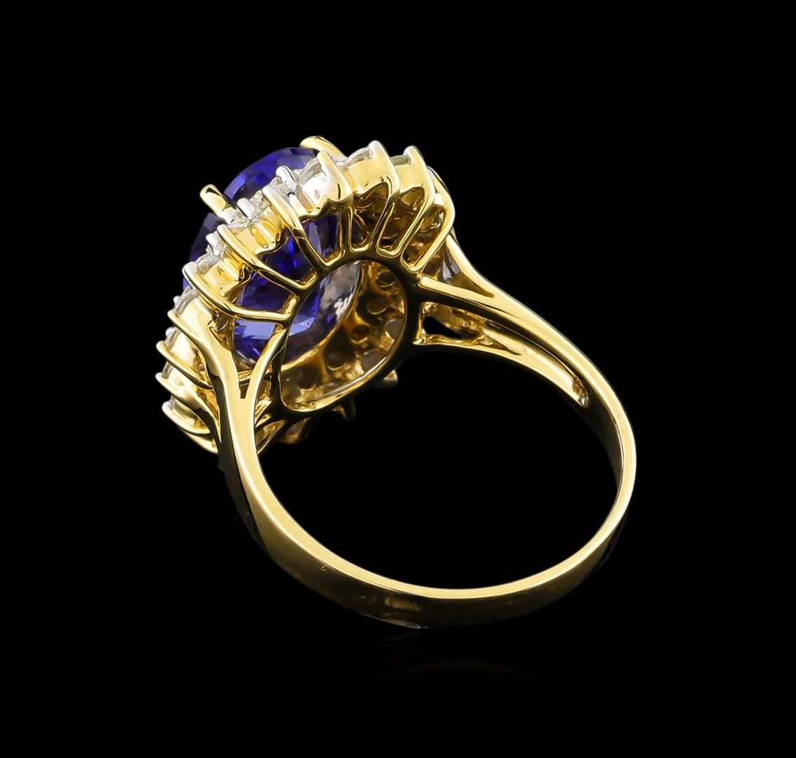 One electronically tested 14KT yellow gold ladies combination cast & assembled tanzanite and diamond ring with a split shank with a bright polish finish. Identified with markings of "14K". Condition is new. Containing: One prong set oval modified brilliant cut natural tanzanite, measuring 11.77 x 8.82 x 5.73mm, approximate weight of 4.07ct., clarity is eye clean, type I, medium, moderately strong, violet color, (GIA V 5/4), cut is good. Forty-Two prong set round brilliant cut diamonds, measuring 2.00 - 1.50 x 1.05mm (depth est.) approximate total weight of 42 Stones = 0.82ct. Clarity: SI-2 to I-1. Color: I - J, Cut is Good. Colored gemstones are presumed to have been subjected to commonly used enhancement processes. All diamonds and colored gemstones are graded in the mounting, unless otherwise stated. Total Weight of Colored Stones 4.07ct. Total Weight of Diamonds 0.82ct. Total Weight of Ring 6.00 grams. GGL Appraised at $9,185.00.