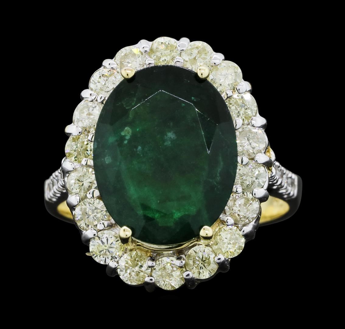 One electronically tested 14KT yellow gold ladies cast emerald and diamond ring. The featured emerald is set within a diamond bezel supported by diamond set shoulders, completed by a two millimeter wide band. Bright polish finish with rhodium accents. Identified with markings of "K14". Condition is new, good workmanship. Containing: One prong set oval mixed cut natural emerald approximate weight of 4.07ct., clarity is heavily included, type III, medium dark, very slightly grayish, very slightly bluish green color, (GIA vslbG 6/3), cut is good. Transmitting light somewhat diffusely, transparent to translucent. Naturally occurring internal & external characteristics are present. Indications of oil residue. Graded in the setting.Ten prong set round brilliant cut diamonds, measuring 1.30 - 1.30 x 0.78mm (depth est.) approximate total weight of 10 Stones = 0.08ct. Graded in the setting. Clarity: I-2 to I-3. Color: G - I Eighteen prong set round brilliant cut diamonds, measuring 2.50 - 2.50 x 1.50mm (depth est.) approximate total weight of 18 Stones = 0.98ct. The group contains a mix of faint to very light yellow color diamonds. Graded in the setting. Clarity: I-2. Total Weight of Colored Stones 4.07ct. Total Weight of Diamonds 1.06ct. Total Weight of Ring 5.25gm. AIG Appraised.