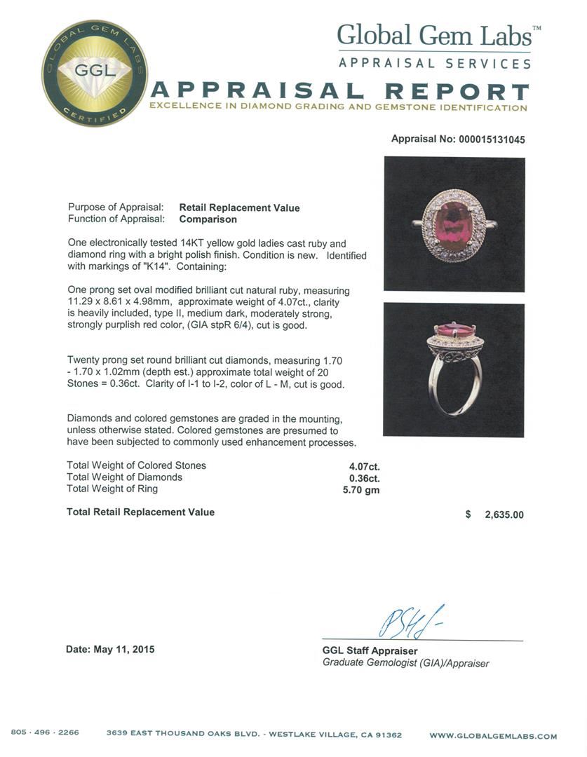 One electronically tested 14KT yellow gold ladies cast ruby and diamond ring with a bright polish finish. Identified with markings of "K14". Condition is new. Containing: One prong set oval modified brilliant cut natural ruby, measuring 11.29 x 8.61 x 4.98mm, approximate weight of 4.07ct., clarity is heavily included, type II, medium dark, moderately strong, strongly purplish red color, (GIA stpR 6/4), cut is good. Twenty prong set round brilliant cut diamonds, measuring 1.70 - 1.70 x 1.02mm (depth est.) approximate total weight of 20 Stones = 0.36ct. Clarity: I-1 to I-2. Color: L - M, Cut is Good. Diamonds and colored gemstones are graded in the mounting, unless otherwise stated. Colored gemstones are presumed to have been subjected to commonly used enhancement processes. Total Weight of Colored Stones 4.07ct. Total Weight of Diamonds 0.36ct. Total Weight of Ring 5.70 grams. GGL Appraised at $2,635.00.