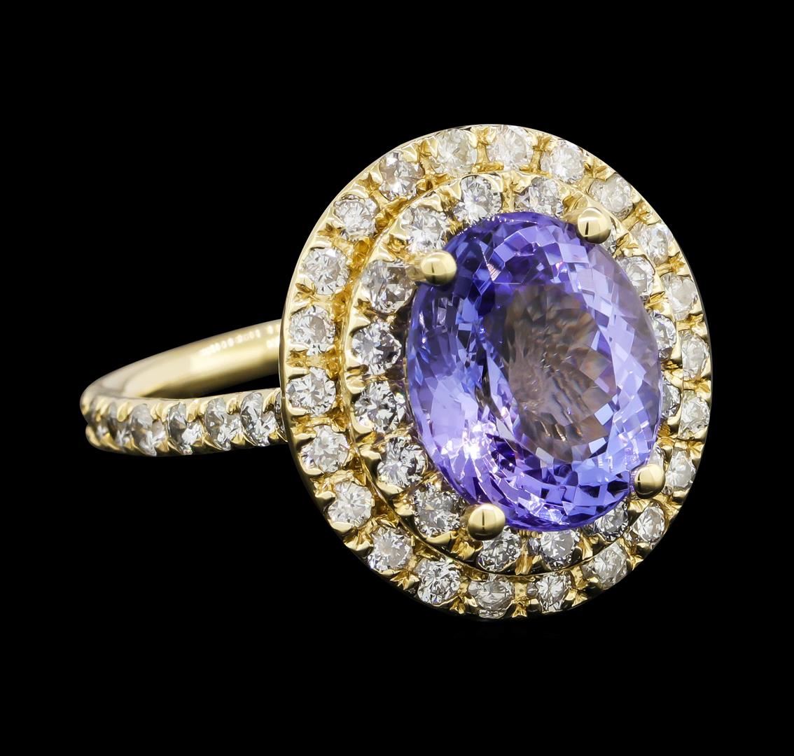 One electronically tested 14KT yellow gold lady's cast fashion ring with a basket double halo with a bright polish finish. The featured lady's ring has a shank measuring 1.92 millimeters wide. Identified with markings of "14K". Condition is new, good workmanship. Containing: One prong set oval modified brilliant cut natural tanzanite, measuring 10.90 x 9.05 x 5.50mm, (depth est.) 5%. bulge factor, approximate weight of 4.09ct., clarity is eye clean, medium light, very slightly grayish, violet color, (GIA V 4/3), cut is very good. Transmitting light with no distortion, transparent. Colored gemstones are presumed to have been subjected to commonly used enhancement processes. Graded in the setting. Fifty-Six prong set round brilliant cut diamonds, measuring 1.90 - 1.80 x 1.13mm (depth est.) approximate total weight of 56 Stones = 1.32ct. Graded in the setting. Clarity: SI-1 to I-1. Color: G - ICut Good. Total Weight of Colored Stones 4.09ct. Total Weight of Diamonds 1.32ct. Total Weight of Ring 5.80gm. GAS Appraised.