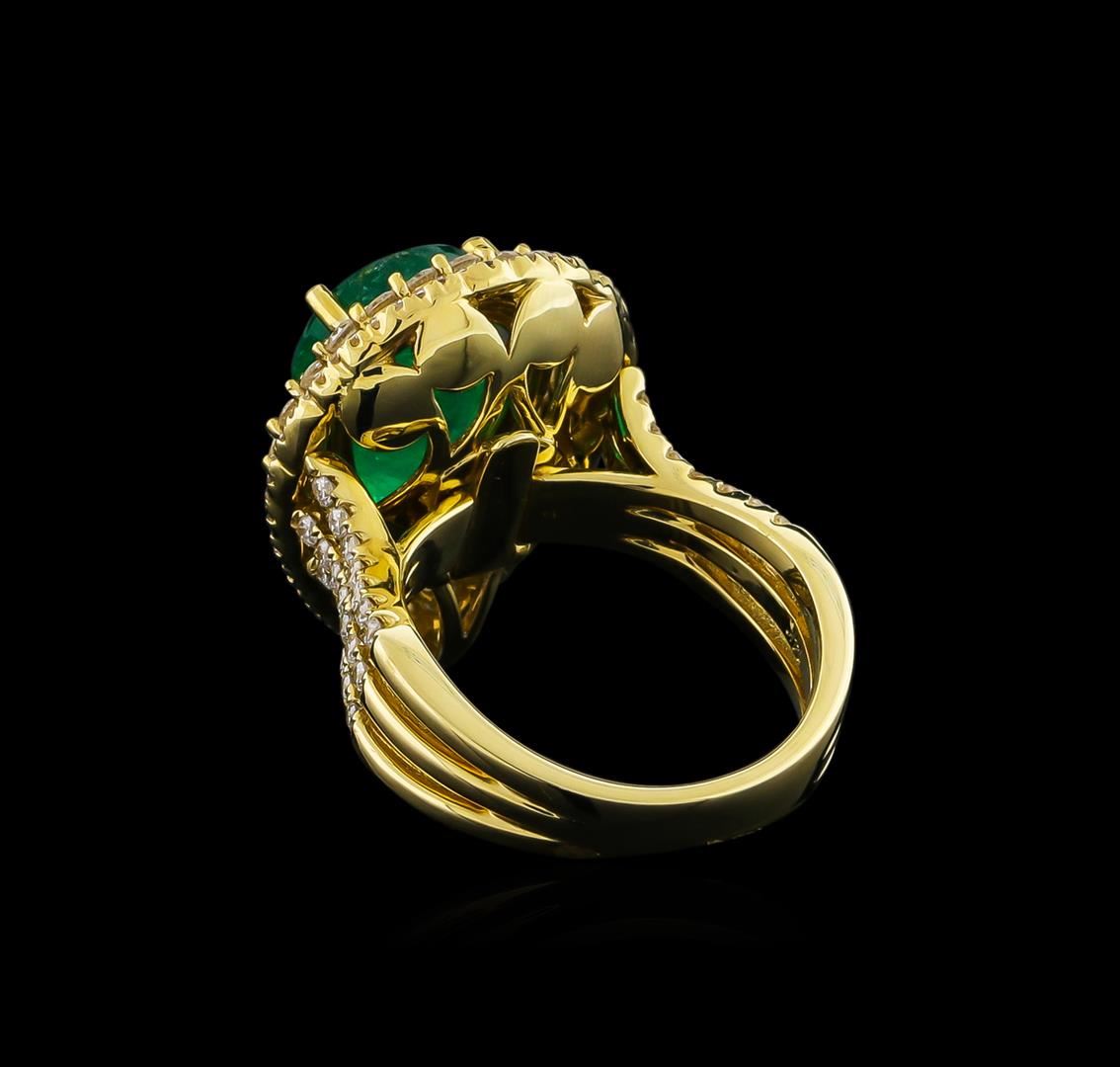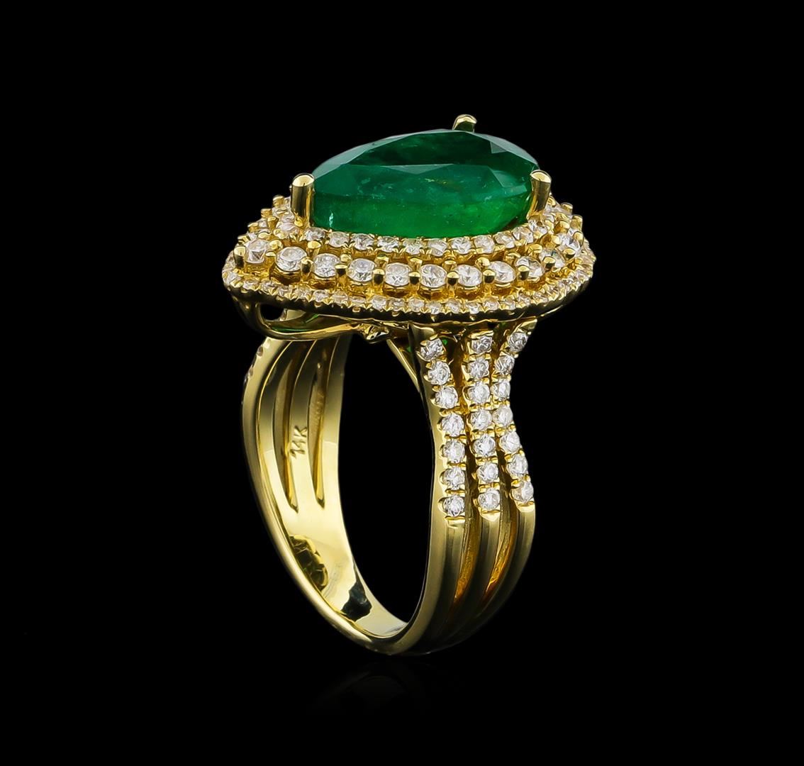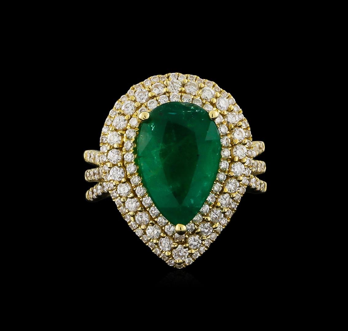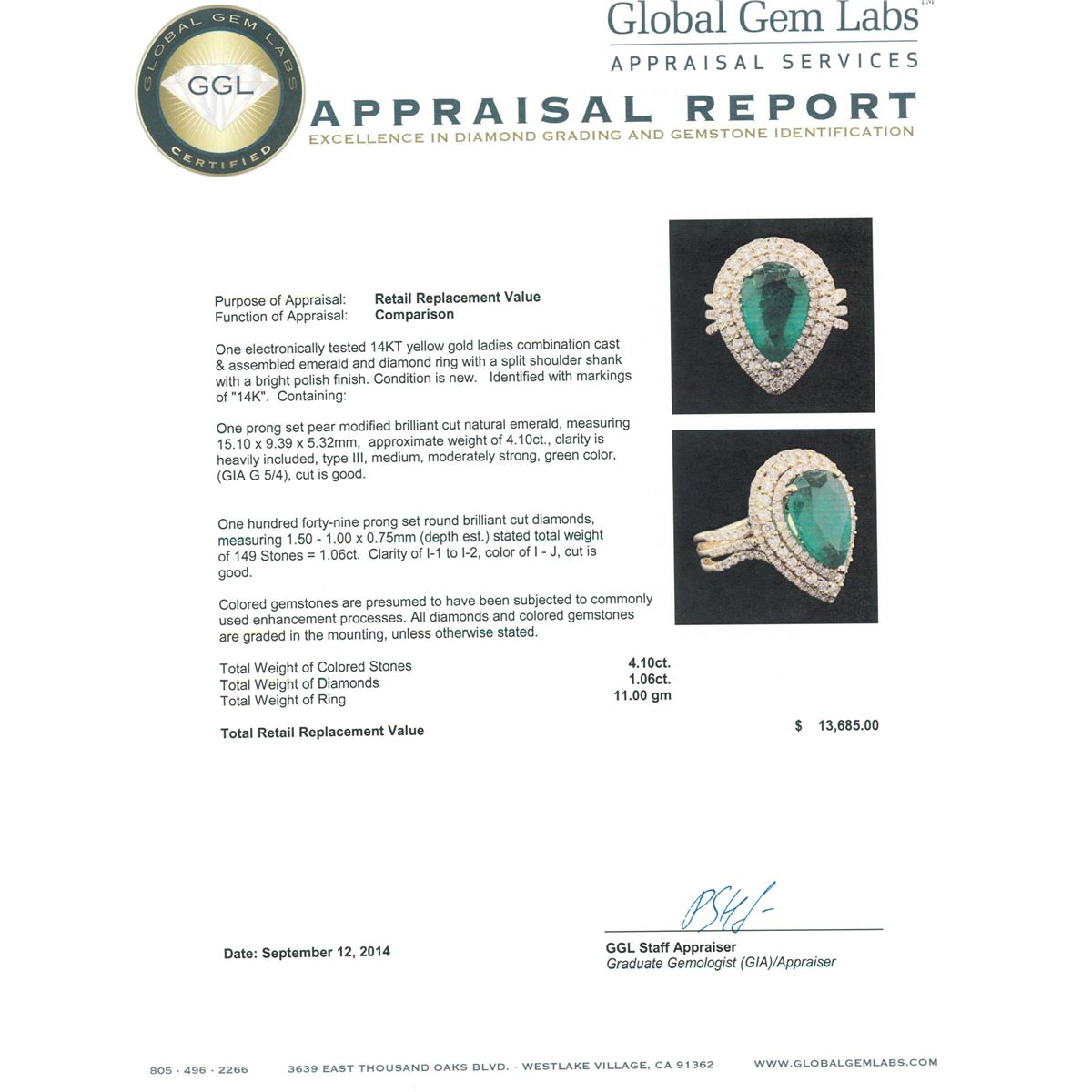 One electronically tested 14KT yellow gold ladies combination cast & assembled emerald and diamond ring with a split shoulder shank with a bright polish finish. Identified with markings of "14K". Condition is new. Containing: One prong set pear modified brilliant cut natural emerald, measuring 15.10 x 9.39 x 5.32mm, approximate weight of 4.10ct., clarity is heavily included, type III, medium, moderately strong, green color, (GIA G 5/4), cut is good. One Hundred Forty-Nine prong set round brilliant cut diamonds, measuring 1.50 - 1.00 x 0.75mm (depth est.) stated total weight of 149 Stones = 1.06ct. Clarity: I-1 to I-2. Color: I - J, Cut is Good. Colored gemstones are presumed to have been subjected to commonly used enhancement processes. All diamonds and colored gemstones are graded in the mounting, unless otherwise stated total weight of Colored Stones 4.10ct. Total Weight of Diamonds 1.06ct. Total Weight of Ring 11.00 grams. GGL Appraised at $13,685.00.