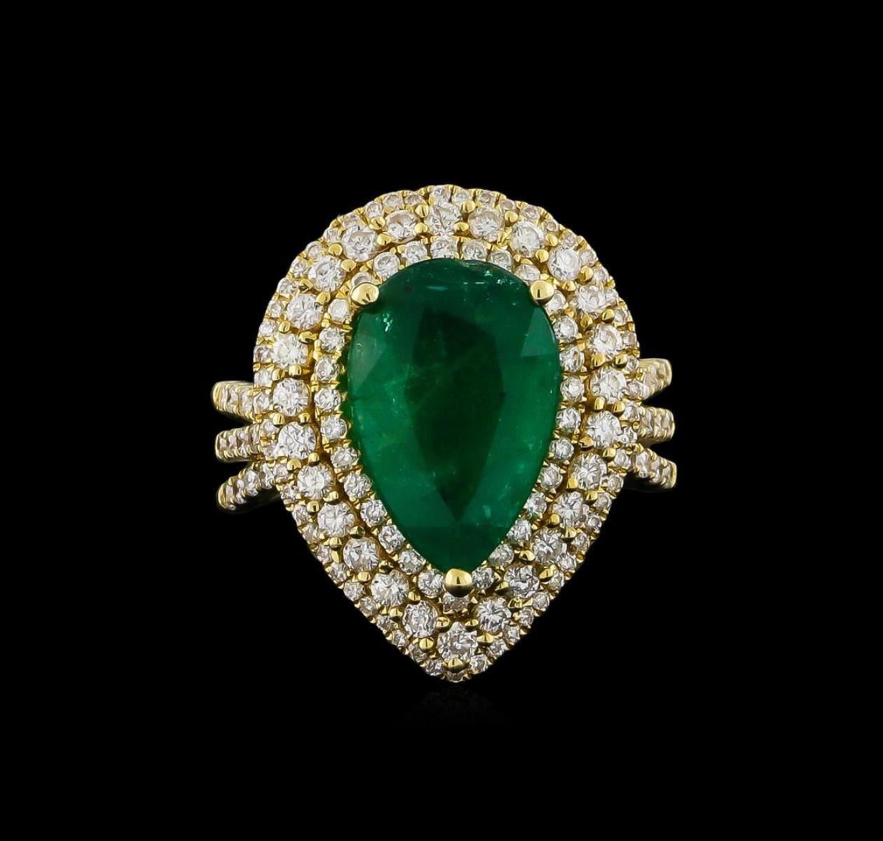 One electronically tested 14KT yellow gold ladies combination cast & assembled emerald and diamond ring with a split shoulder shank with a bright polish finish. Identified with markings of "14K". Condition is new. Containing: One prong set pear modified brilliant cut natural emerald, measuring 15.10 x 9.39 x 5.32mm, approximate weight of 4.10ct., clarity is heavily included, type III, medium, moderately strong, green color, (GIA G 5/4), cut is good. One Hundred Forty-Nine prong set round brilliant cut diamonds, measuring 1.50 - 1.00 x 0.75mm (depth est.) stated total weight of 149 Stones = 1.06ct. Clarity: I-1 to I-2. Color: I - J, Cut is Good. Colored gemstones are presumed to have been subjected to commonly used enhancement processes. All diamonds and colored gemstones are graded in the mounting, unless otherwise stated total weight of Colored Stones 4.10ct. Total Weight of Diamonds 1.06ct. Total Weight of Ring 11.00 grams. GGL Appraised.