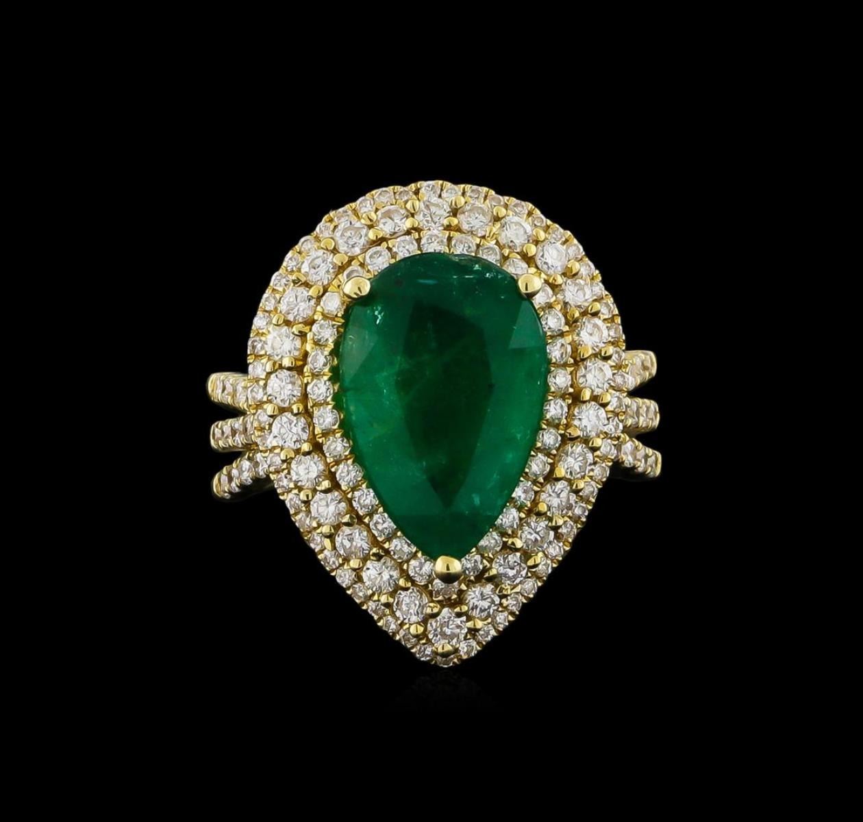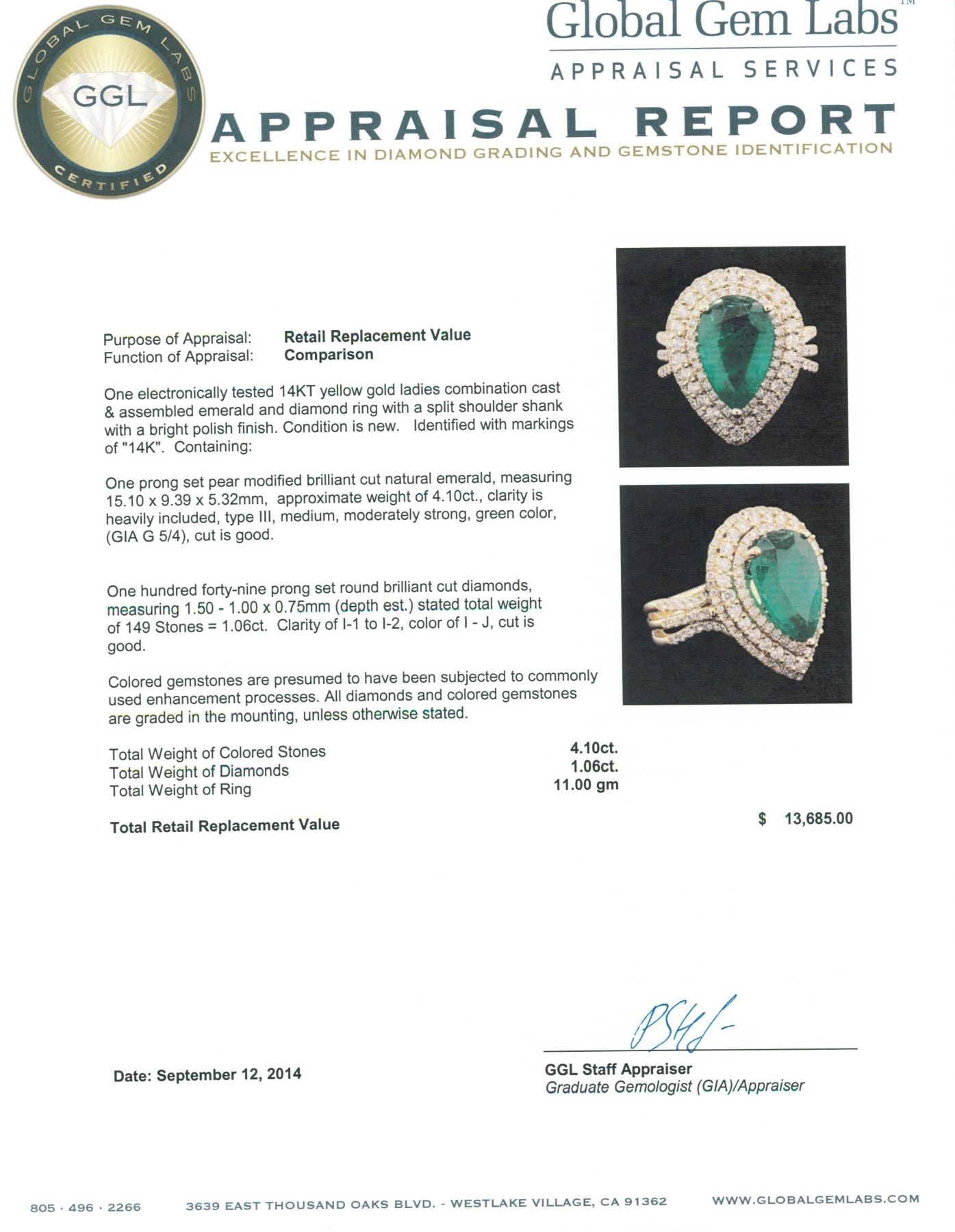 One electronically tested 14KT yellow gold ladies combination cast & assembled emerald and diamond ring with a split shoulder shank with a bright polish finish. Identified with markings of "14K". Condition is new. Containing: One prong set pear modified brilliant cut natural emerald, measuring 15.10 x 9.39 x 5.32mm, approximate weight of 4.10 ct., clarity is heavily included, type III, medium, moderately strong, green color, (GIA G 5/4), cut is good. One Hundred Forty-Nine prong set round brilliant cut diamonds, measuring 1.50 - 1.00 x 0.75mm (depth est.) stated total weight of 149 Stones = 1.06ct. Clarity: I-1 to I-2. Color: I - J, Cut is Good. Colored gemstones are presumed to have been subjected to commonly used enhancement processes. All diamonds and colored gemstones are graded in the mounting, unless otherwise stated total weight of Colored Stones 4.10 ct. Total Weight of Diamonds 1.06ct. Total Weight of Ring 11.00 grams. GGL Appraised.