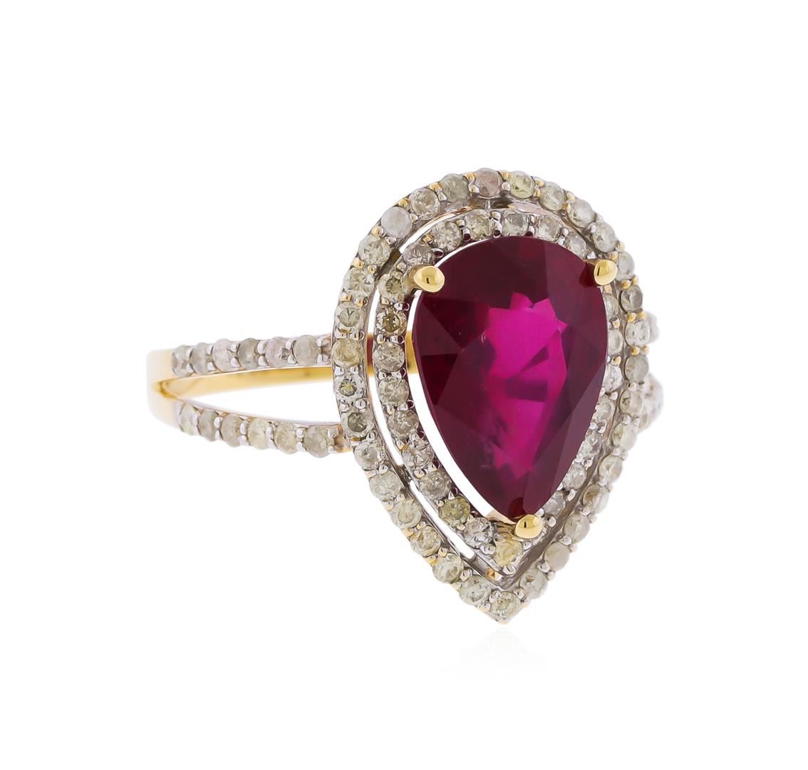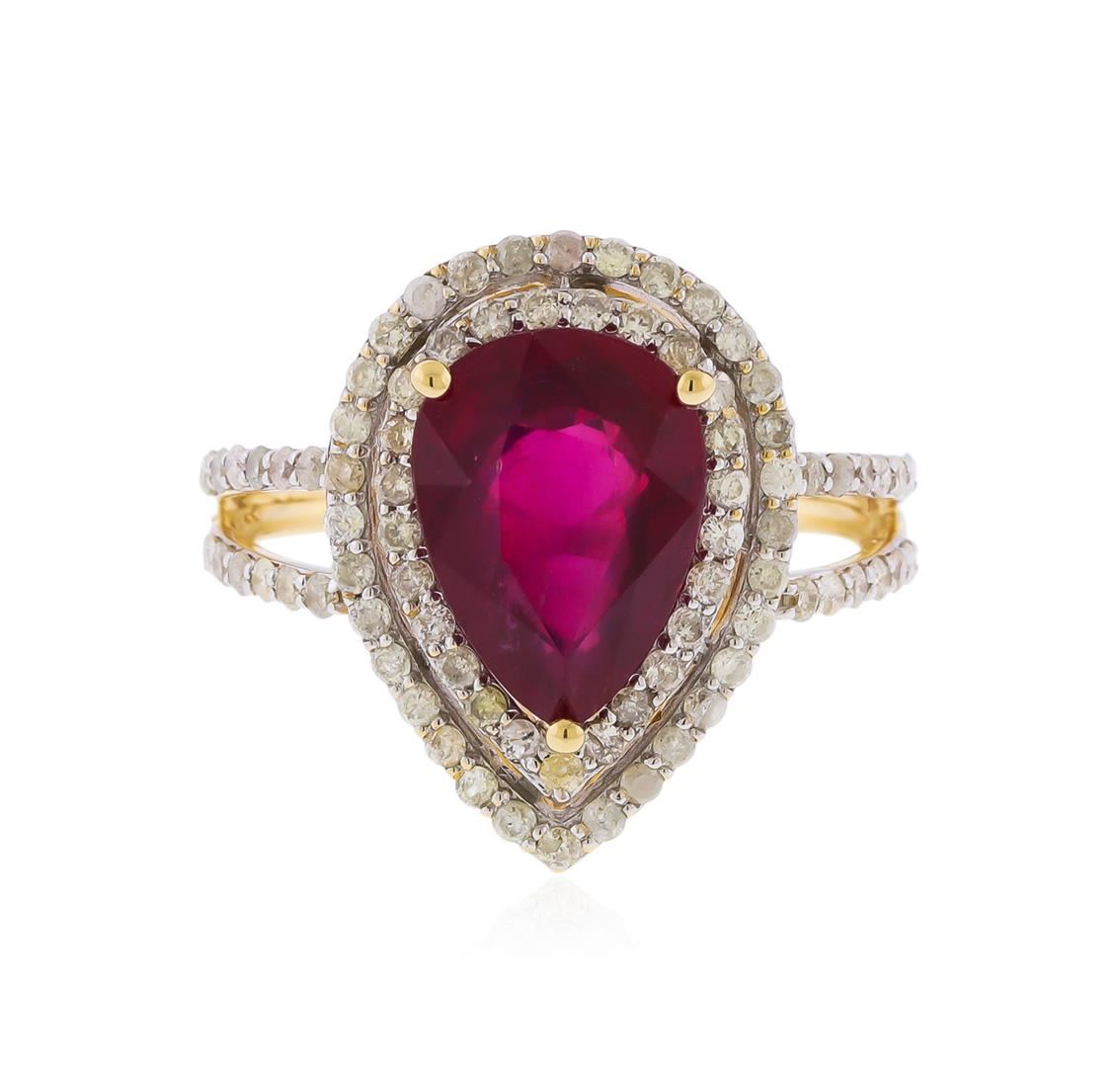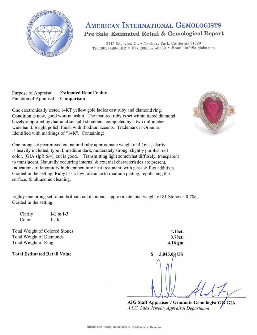 One electronically tested 14KT yellow gold ladies cast ruby and diamond ring. The featured ruby is set within tiered diamond bezels supported by diamond set split shoulders, completed by a two millimeter wide band. Bright polish finish with rhodium accents. Trademark is Orianne. Identified with markings of "14K". Condition is new, good workmanship. Containing: One prong set pear mixed cut natural ruby approximate weight of 4.16ct., clarity is heavily included, type II, medium dark, moderately strong, slightly purplish red color, (GIA slpR 6/4), cut is good. Transmitting light somewhat diffusely, transparent to translucent. Naturally occurring internal & external characteristics are present. Indications of laboratory high temperature heat treatment, with glass & flux additives. Graded in the setting. Ruby has a low tolerance to rhodium plating, repolishing the surface, & ultrasonic cleaning.Eighty-One prong set round brilliant cut diamonds approximate total weight of 81 Stones = 0.78ct. Graded in the setting. Clarity: I-1 to I-3. Color: I - K. Total Weight of Colored Stones 4.16ct. Total Weight of Diamonds 0.78ct. Total Weight of Ring 4.16gm. AIG Appraised at $3,045.00.
