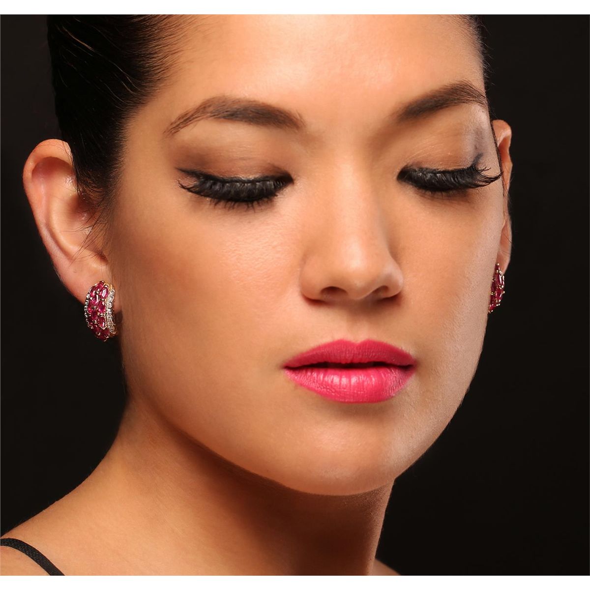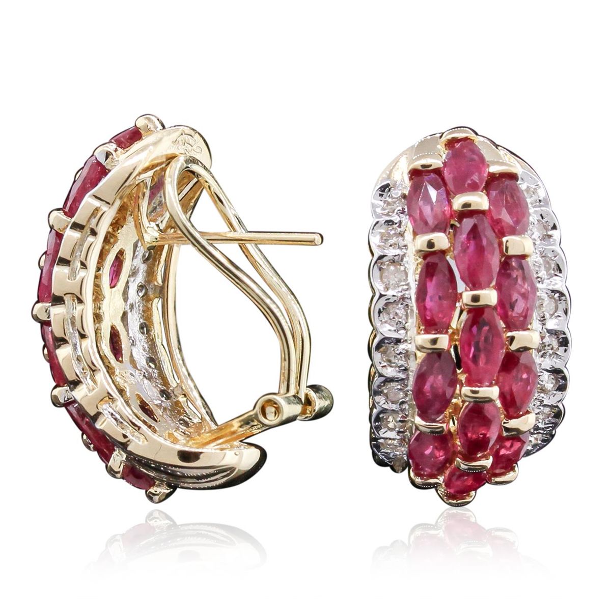 One pair electronically tested 14KT yellow gold ladies cast & assembled ruby and diamond earrings with omega backs. Condition is new, good workmanship. Each earring features a stylized ruby curvature set within mirroring diamond ribbons. Bright polish finish with rhodium accents. Identified with markings of "14K 585". Containing: Twenty-six prong set marquise mixed cut natural rubies, measuring 5.00 x 2.50 x 1.63mm, 5%. bulge factor, approximate. Total Weight of 4.16ct., clarity is moderately included, type II, medium dark, very slightly brownish, slightly purplish red color, (GIA slpR 6/3), cut is good. Transmitting light somewhat diffusely, transparent to translucent. Naturally occurring internal & external characteristics are present. Measurements & the color grade are an average for the group. Graded in the setting. Ruby has a low tolerance to rhodium plating, repolishing the surface, & ultrasonic cleaning. Thirty-Two bead set round brilliant cut diamonds, measuring 1.50 - 1.40 x 0.87mm (depth est.) approximate. Total Weight of 32 Stones = 0.45ct. Graded in the setting. Clarity: I-1 to I-2. Color: H - J. Total Weight of Colored Stones 4.16ct. Total Weight of Diamonds 0.45ct. Total Weight of Earrings 9.72 grams. AIG Appraised at $5,950.00.