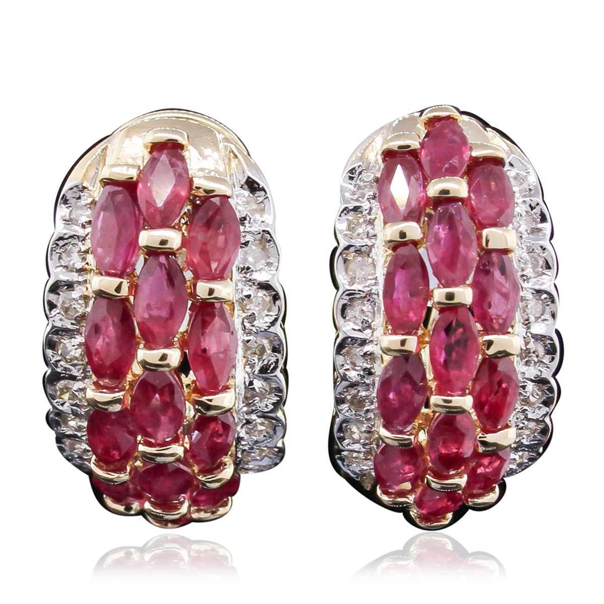 One pair electronically tested 14KT yellow gold ladies cast & assembled ruby and diamond earrings with omega backs. Condition is new, good workmanship. Each earring features a stylized ruby curvature set within mirroring diamond ribbons. Bright polish finish with rhodium accents. Identified with markings of "14K 585". Containing: Twenty-six prong set marquise mixed cut natural rubies, measuring 5.00 x 2.50 x 1.63mm, 5%. bulge factor, approximate. Total Weight of 4.16ct., clarity is moderately included, type II, medium dark, very slightly brownish, slightly purplish red color, (GIA slpR 6/3), cut is good. Transmitting light somewhat diffusely, transparent to translucent. Naturally occurring internal & external characteristics are present. Measurements & the color grade are an average for the group. Graded in the setting. Ruby has a low tolerance to rhodium plating, repolishing the surface, & ultrasonic cleaning. Thirty-Two bead set round brilliant cut diamonds, measuring 1.50 - 1.40 x 0.87mm (depth est.) approximate. Total Weight of 32 Stones = 0.45ct. Graded in the setting. Clarity: I-1 to I-2. Color: H - J. Total Weight of Colored Stones 4.16ct. Total Weight of Diamonds 0.45ct. Total Weight of Earrings 9.72 grams. AIG Appraised at $5,950.00.