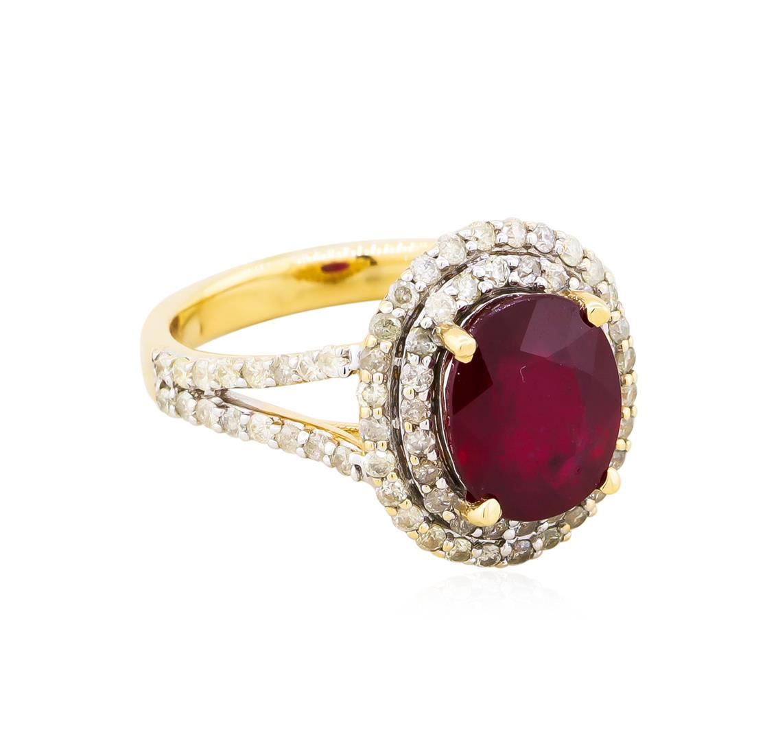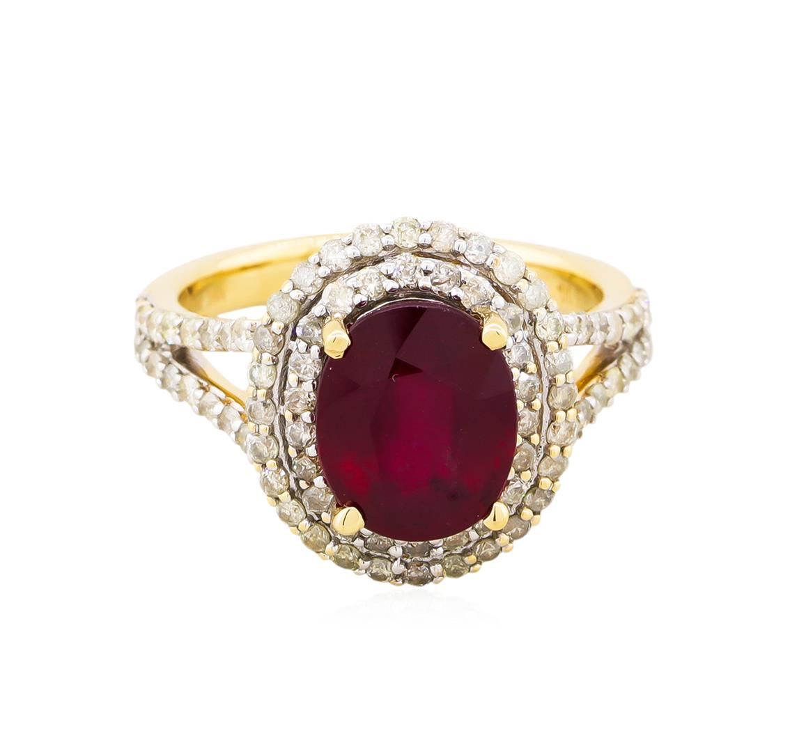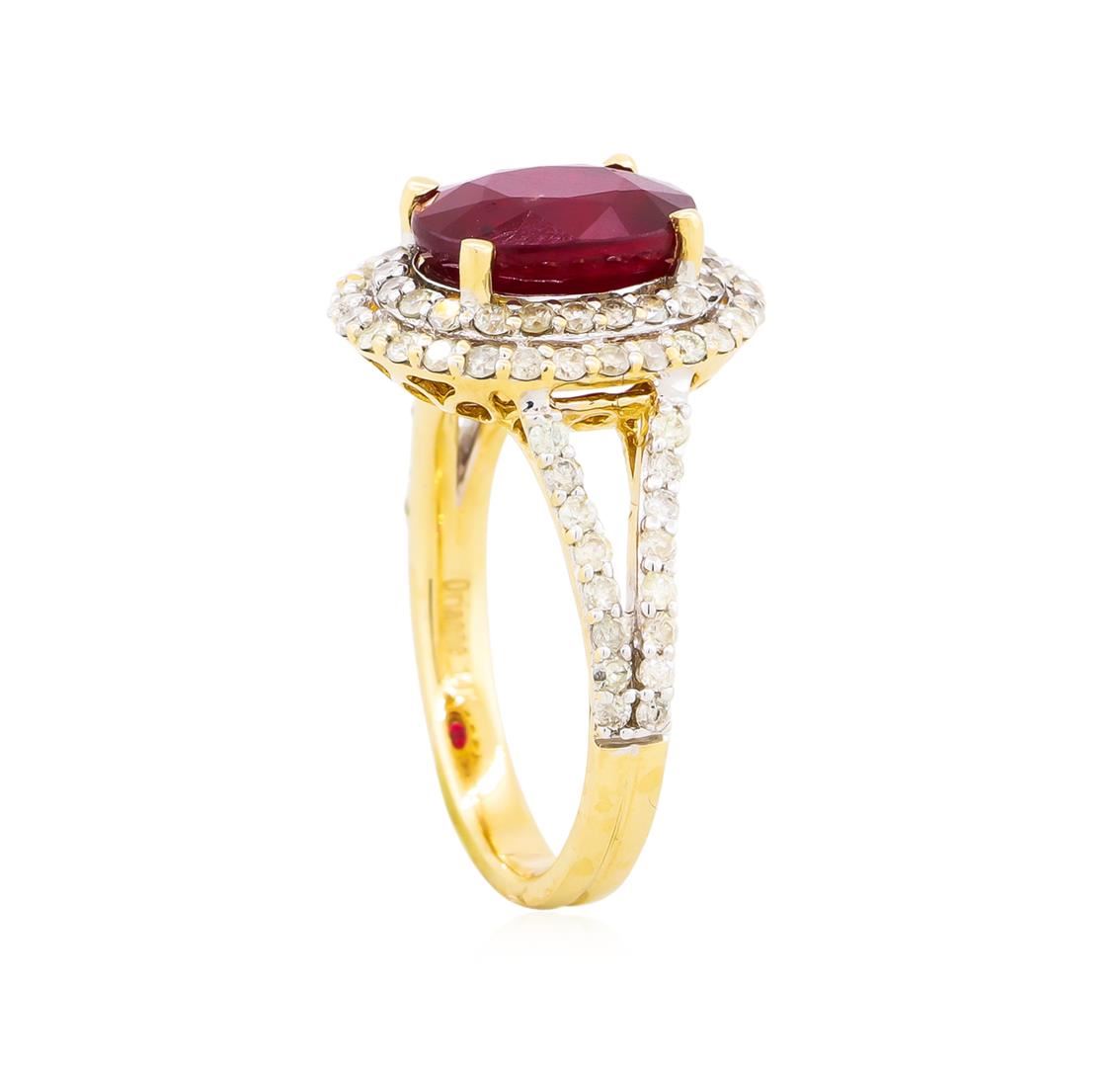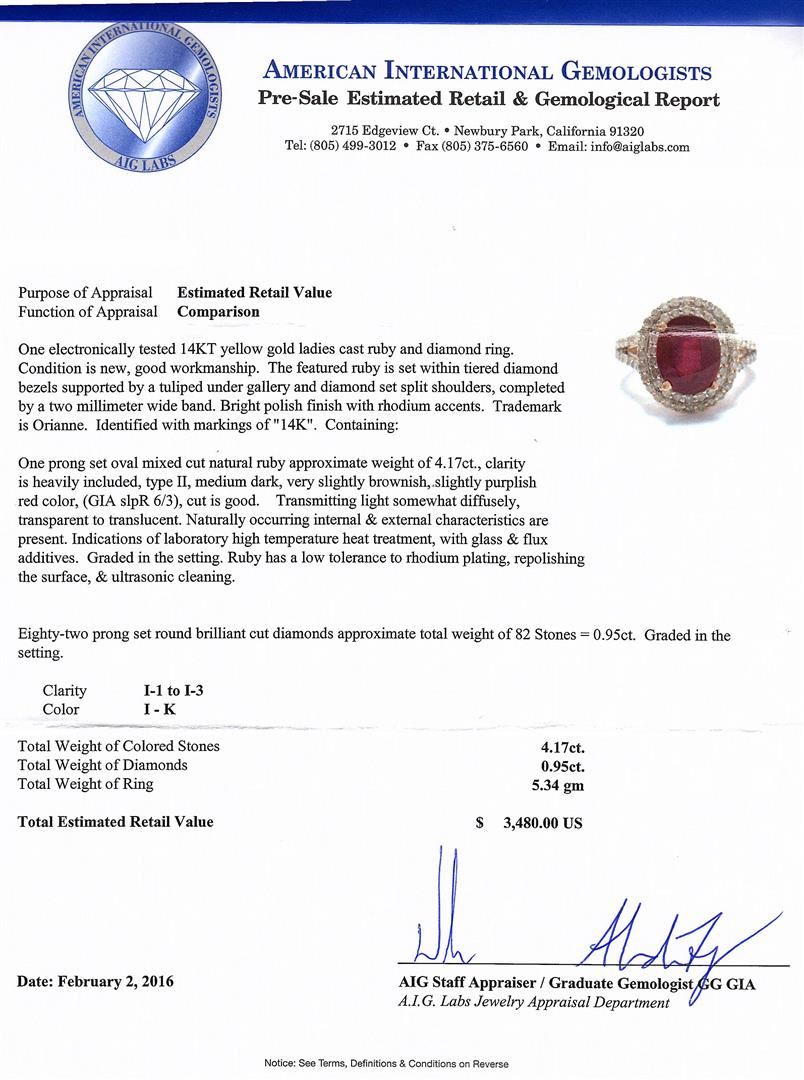 One electronically tested 14KT yellow gold ladies cast ruby and diamond ring. The featured ruby is set within tiered diamond bezels supported by a tuliped under gallery and diamond set split shoulders, completed by a two millimeter wide band. Bright polish finish with rhodium accents. Trademark is Orianne. Identified with markings of "14K". Condition is new, good workmanship. Containing: One prong set oval mixed cut natural ruby approximate weight of 4.17ct., clarity is heavily included, type II, medium dark, very slightly brownish, slightly purplish red color, (GIA slpR 6/3), cut is good. Transmitting light somewhat diffusely, transparent to translucent. Naturally occurring internal & external characteristics are present. Indications of laboratory high temperature heat treatment, with glass & flux additives. Graded in the setting. Ruby has a low tolerance to rhodium plating, repolishing the surface, & ultrasonic cleaning.Eighty-Two prong set round brilliant cut diamonds approximate. Total Weight of 82 Stones = 0.95ct. Graded in the setting. Clarity: I-1 to I-3. Color: I - K. Total Weight of Colored Stones 4.17ct. Total Weight of Diamonds 0.95ct. Total Weight of Ring 5.34gm. AIG Appraised at $3,480.00.