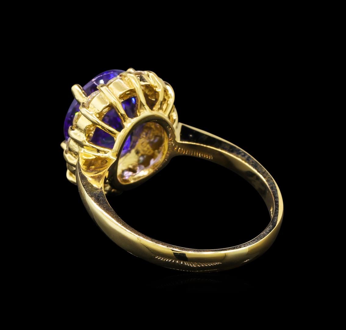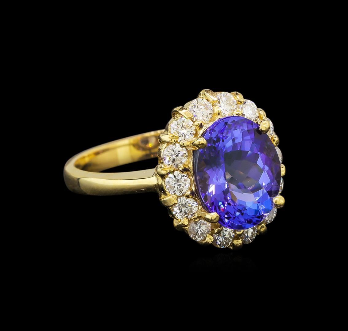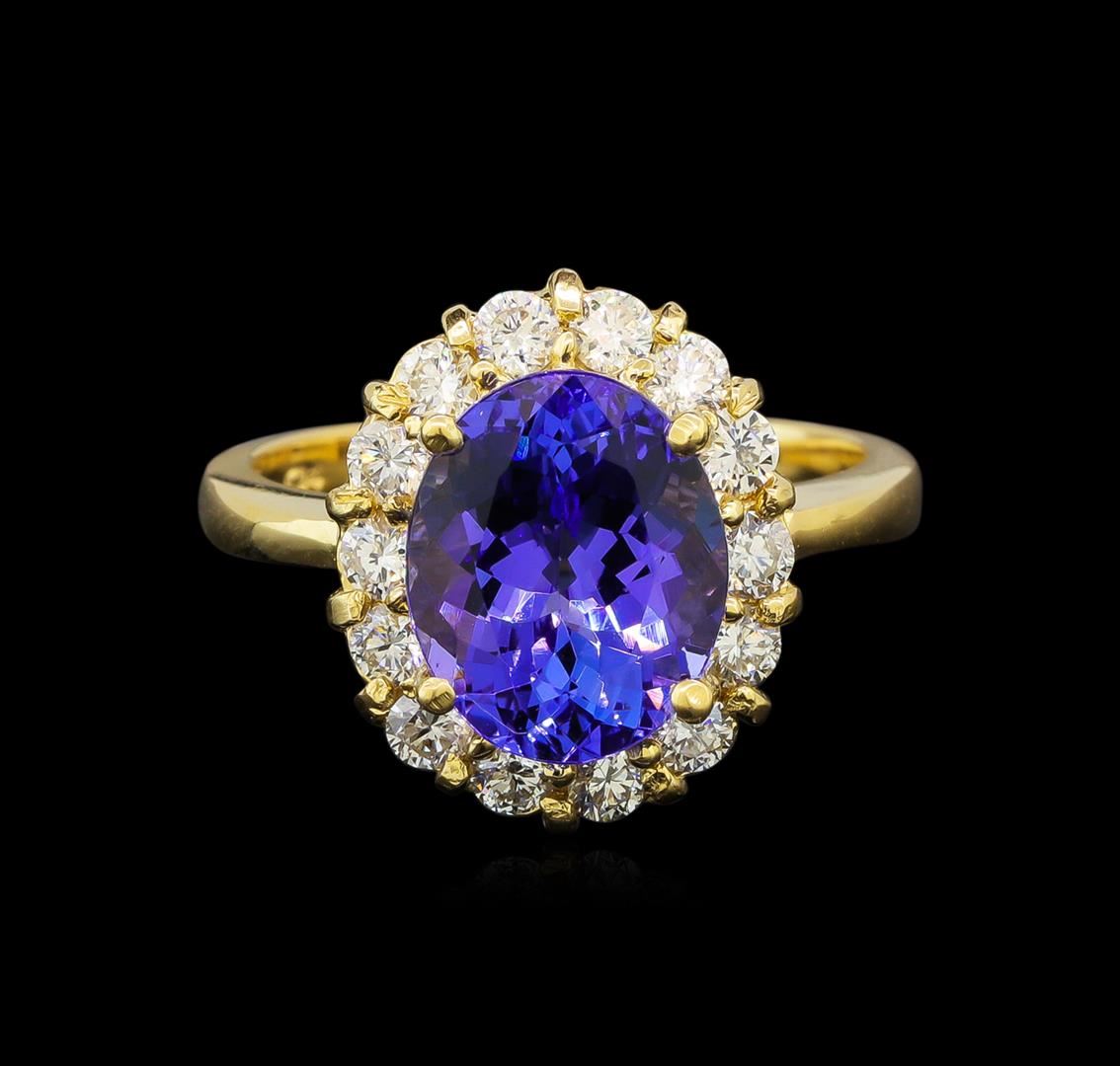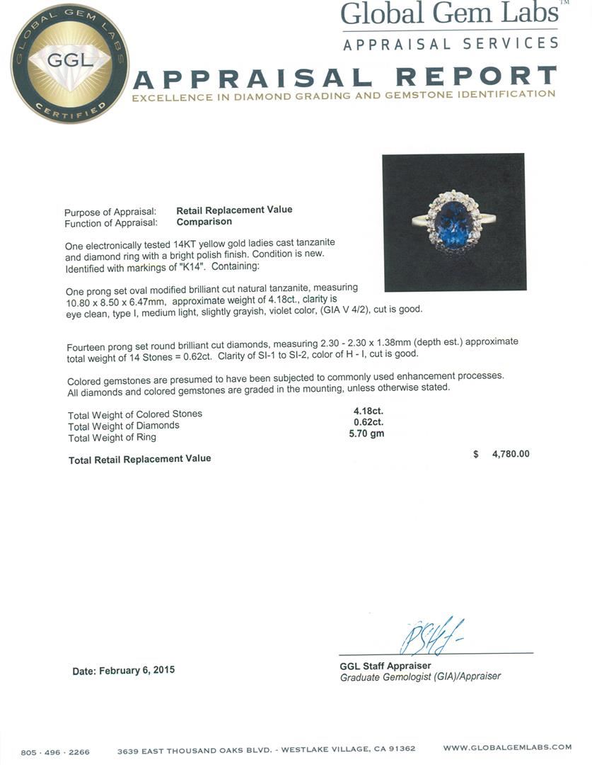 One electronically tested 14KT yellow gold ladies cast tanzanite and diamond ring with a bright polish finish. Identified with markings of "K14". Condition is new. Containing: One prong set oval modified brilliant cut natural tanzanite, measuring 10.80 x 8.50 x 6.47mm, approximate weight of 4.18ct., clarity is eye clean, type I, medium light, slightly grayish, violet color, (GIA V 4/2), cut is good. Fourteen prong set round brilliant cut diamonds, measuring 2.30 - 2.30 x 1.38mm (depth est.) approximate total weight of 14 Stones = 0.62ct. Clarity: SI-1 to SI-2. Color: H - I, Cut is Good. Colored gemstones are presumed to have been subjected to commonly used enhancement processes. All diamonds and colored gemstones are graded in the mounting, unless otherwise stated. Total Weight of Colored Stones 4.18ct. Total Weight of Diamonds 0.62ct. Total Weight of Ring 5.70 grams. GGL Appraised at $4,780.00.