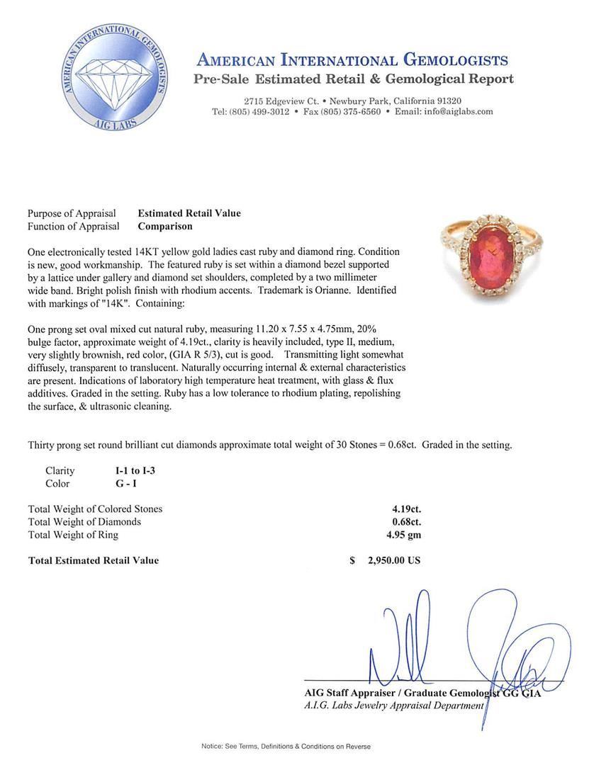 One electronically tested 14KT yellow gold ladies cast ruby and diamond ring. The featured ruby is set within tiered diamond bezels supported by a lattice under gallery and diamond set shoulders, completed by a two millimeter wide band. Bright polish finish with rhodium accents. Trademark is Orianne. Identified with markings of "14K". Condition is new, good workmanship. Containing: One prong set oval mixed cut natural ruby, measuring 12.55 x 10.05 x 6.95mm, 8%. bulge factor, approximate weight of 7.89ct., clarity is heavily included, type II, dark, very slightly brownish, slightly purplish red color, (GIA slpR 7/3), cut is good. Transmitting light somewhat diffusely, transparent to translucent. Naturally occurring internal & external characteristics are present. Indications of laboratory high temperature heat treatment, with glass & flux additives. Graded in the setting. Ruby has a low tolerance to rhodium plating, repolishing the surface, & ultrasonic cleaning. Seventy-Two prong set round brilliant cut diamonds approximate total weight of 72 Stones = 0.66ct. Naturally occurring internal & external characteristics are present, including yellow patches of color. Graded in the setting. Clarity: I-1 to I-3. Color: J - L. Total Weight of Colored Stones 7.89ct. Total Weight of Diamonds 0.66ct. Total Weight of Ring 6.58gm. AIG Appraised at $2,950.00.