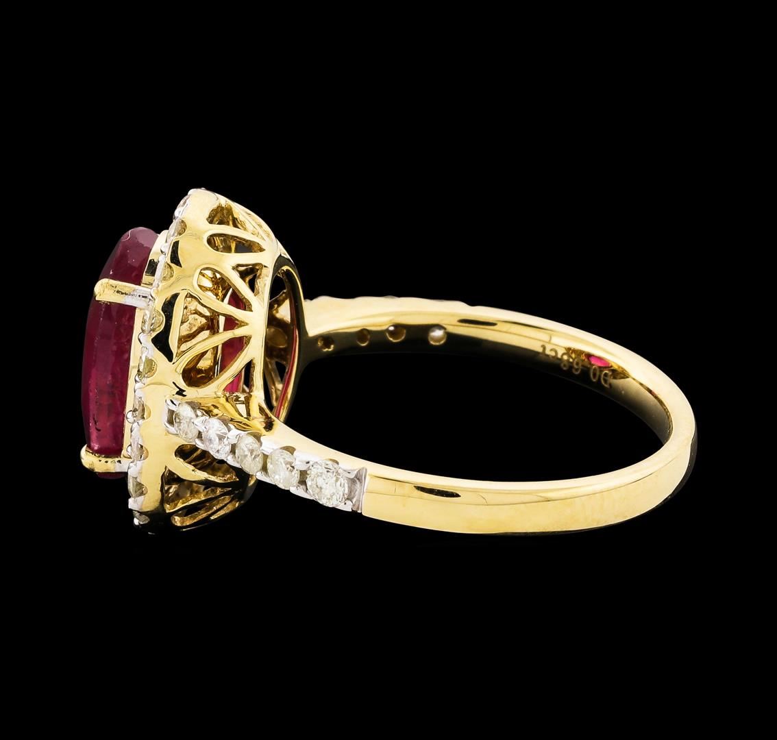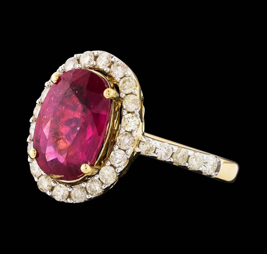 One electronically tested 14KT yellow gold ladies cast ruby and diamond ring. The featured ruby is set within a diamond bezel supported by a lattice under gallery and diamond set shoulders, completed by a two millimeter wide band. Bright polish finish with rhodium accents. Trademark is Orianne. Identified with markings of "14K". Condition is new, good workmanship. Containing: One prong set oval mixed cut natural ruby, measuring 11.20 x 7.55 x 4.75mm, 20%. bulge factor, approximate weight of 4.19ct., clarity is heavily included, type II, medium, very slightly brownish, red color, (GIA R 5/3), cut is good. Transmitting light somewhat diffusely, transparent to translucent. Naturally occurring internal & external characteristics are present. Indications of laboratory high temperature heat treatment, with glass & flux additives. Graded in the setting. Ruby has a low tolerance to rhodium plating, repolishing the surface, & ultrasonic cleaning. Thirty prong set round brilliant cut diamonds approximate total weight of 30 Stones = 0.68ct. Graded in the setting. Clarity: I-1 to I-3. Color: G - I. Total Weight of Colored Stones 4.19ct. Total Weight of Diamonds 0.68ct. Total Weight of Ring 4.95gm. AIG Appraised.
