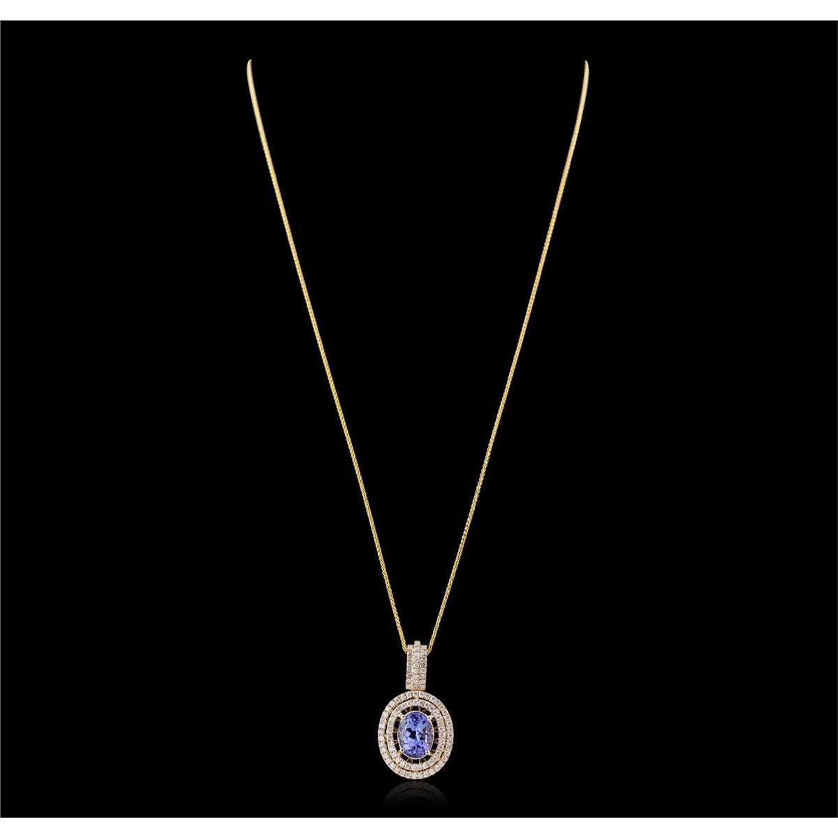 One electronically tested 14KT yellow gold ladies cast & assembled tanzanite and diamond ring. The pendant features a tanzanite set within two tiered diamond bezels, completed by a diamond set bail. The pendant is supported by an eighteen inch length 14KT yellow gold designer style chain, terminating in a lobster claw clasp. Bright polish finish. Trademark is Orianne. Identified with markings of "14K". Condition is new, good workmanship. One prong set oval brilliant cut natural tanzanite, measuring 10.90 x 8.30 x 6.40mm, 6% bulge factor, approximate weight of 4.19ct., clarity is eye clean, type I, medium dark, very slightly grayish, bluish violet color, (GIA bV 6/3), cut is good. Transmitting light with no distortion, transparent. Graded in the setting. Tanzanite is a very rare gemstone that is only found in the country of Tanzania. Originally discovered in 1967. Tiffany & Company, named the stone Tanzanite. It is found in the Usumburu Mountains that border the Umba Valley of northern Tanzania. Tanzanite occurs in gray, brown, violet, blue, reddish-purple, & green. The gem is interesting because of its exceptional pleochroism. Rotated in different directions a tanzanite will exhibit multiple changes of color. Tanzanite has a low tolerance to ultrasonic cleaning, and should not be cleaned using this method. Ninety-Five prong set round brilliant cut diamonds, measuring 1.50 - 1.30 x 0.84mm (depth est.) approximate total weight of 95 Stones = 0.97ct. Graded in the setting. Clarity: I-1 to I-2. Color: G - I. Total Weight of Colored Stones 4.19ct. Total Weight of Diamonds 0.97ct. Total Weight of Ring 8.20 grams. AIG Appraised at $14,375.00.