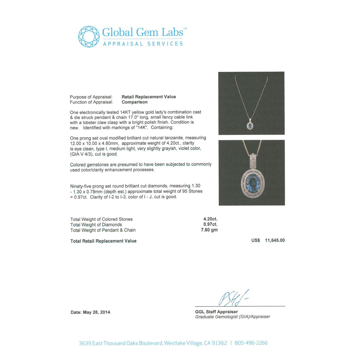 One electronically tested 14KT yellow gold Ladies combination cast & die struck pendant & chain 17.0" long, small fancy cable link with a lobster claw clasp with a bright polish finish. Condition is new. Identified with markings of "14K". Containing: One prong set oval modified brilliant cut natural tanzanite, measuring 12.00 x 10.00 x 4.80mm, approximate weight of 4.20ct., clarity is eye clean, type I, medium light, very slightly grayish, violet color, (GIA V 4/3), cut is good. Colored gemstones are presumed to have been subjected to commonly used color/clarity enhancement processes. Ninety-Five prong set round brilliant cut diamonds, measuring 1.30 - 1.30 x 0.78mm (depth est.) approximate. Total Weight of 95 Stones = 0.97ct. Clarity: I-2 to I-3. Color: I - J, Cut is Good. Total Weight of Colored Stones 4.20ct. Total Weight of Diamonds 0.97ct. Total Weight of Pendant & Chain 7.60 grams. GGL Appraised at $11,645.00.