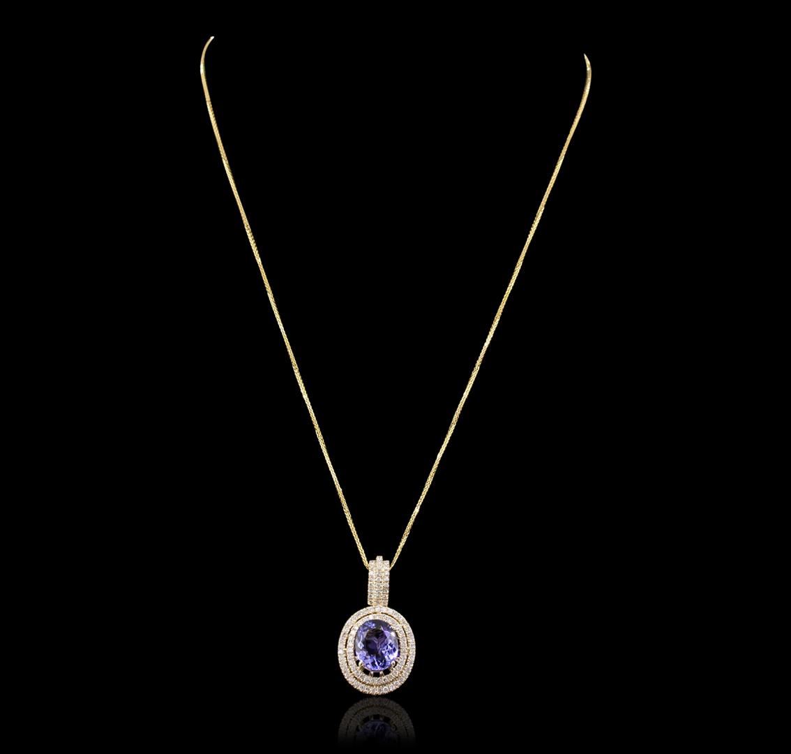 One electronically tested 14KT yellow gold Ladies combination cast & die struck pendant & chain 17.0" long, small fancy cable link with a lobster claw clasp with a bright polish finish. Condition is new. Identified with markings of "14K". Containing: One prong set oval modified brilliant cut natural tanzanite, measuring 12.00 x 10.00 x 4.80mm, approximate weight of 4.20ct., clarity is eye clean, type I, medium light, very slightly grayish, violet color, (GIA V 4/3), cut is good. Colored gemstones are presumed to have been subjected to commonly used color/clarity enhancement processes. Ninety-Five prong set round brilliant cut diamonds, measuring 1.30 - 1.30 x 0.78mm (depth est.) approximate. Total Weight of 95 Stones = 0.97ct. Clarity: I-2 to I-3. Color: I - J, Cut is Good. Total Weight of Colored Stones 4.20ct. Total Weight of Diamonds 0.97ct. Total Weight of Pendant & Chain 7.60 grams. GGL Appraised at $11,645.00.