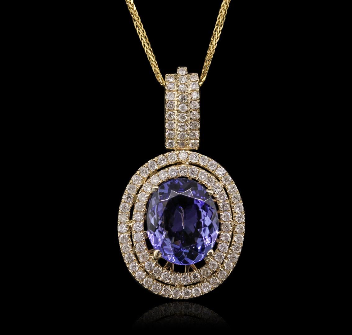 One electronically tested 14KT yellow gold Ladies combination cast & die struck pendant & chain 17.0" long, small fancy cable link with a lobster claw clasp with a bright polish finish. Condition is new. Identified with markings of "14K". Containing: One prong set oval modified brilliant cut natural tanzanite, measuring 12.00 x 10.00 x 4.80mm, approximate weight of 4.20ct., clarity is eye clean, type I, medium light, very slightly grayish, violet color, (GIA V 4/3), cut is good. Colored gemstones are presumed to have been subjected to commonly used color/clarity enhancement processes. Ninety-Five prong set round brilliant cut diamonds, measuring 1.30 - 1.30 x 0.78mm (depth est.) approximate. Total Weight of 95 Stones = 0.97ct. Clarity: I-2 to I-3. Color: I - J, Cut is Good. Total Weight of Colored Stones 4.20ct. Total Weight of Diamonds 0.97ct. Total Weight of Pendant & Chain 7.60 grams. GGL Appraised at $11,645.00.