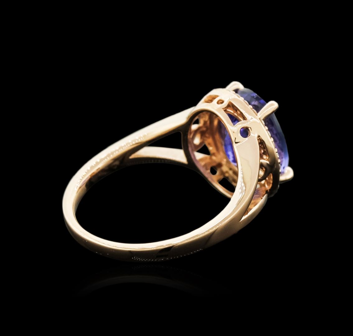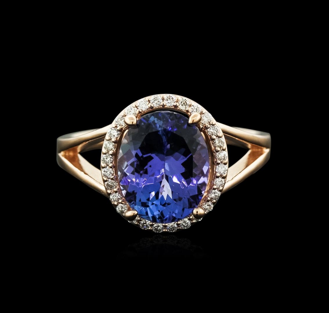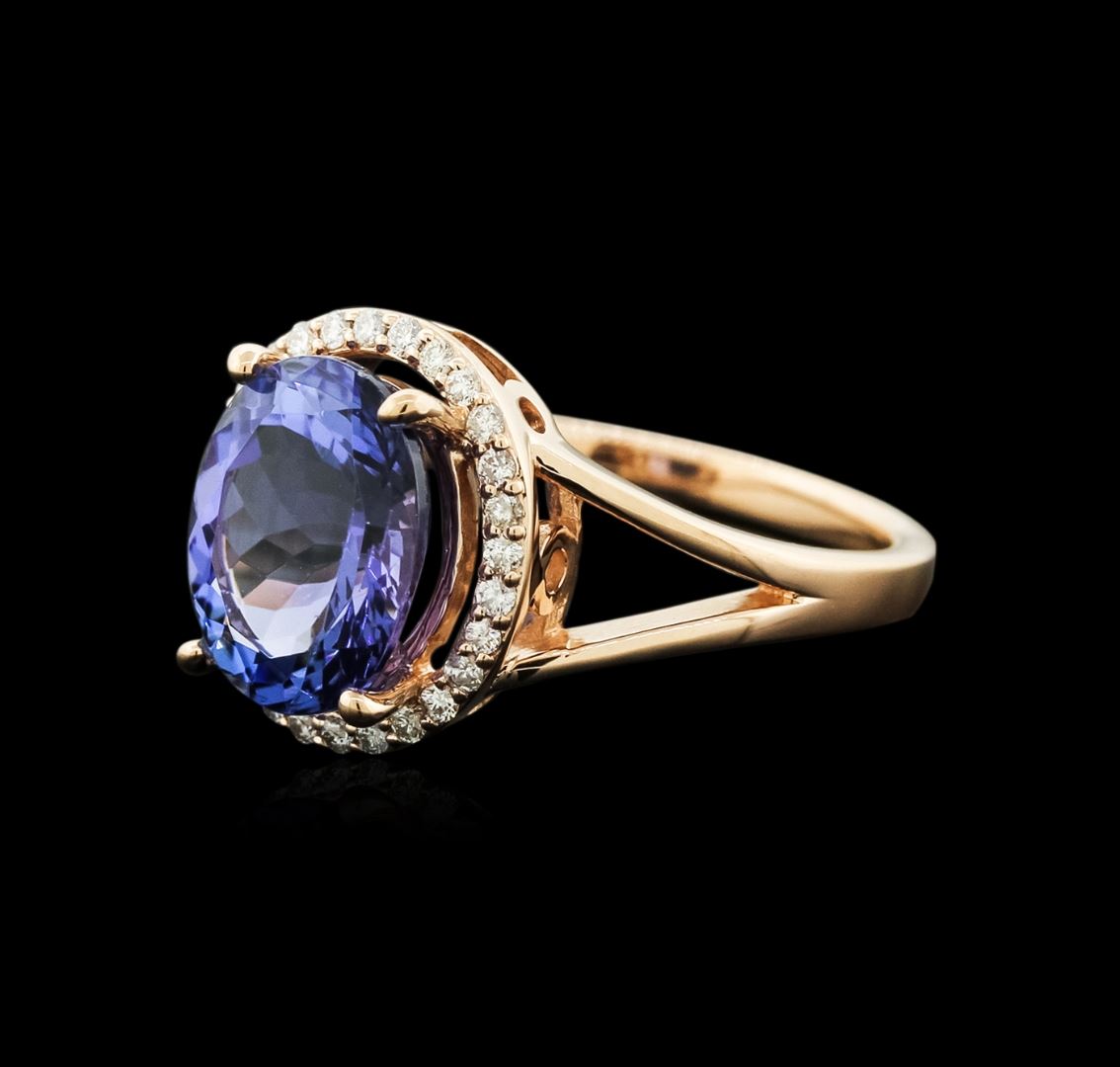 One electronically tested 14KT yellow gold ladies cast tanzanite and diamond ring with a bright polish finish. Identified with markings of "14K". Condition is new. Containing: One prong set oval modified brilliant cut natural tanzanite, measuring 10.50 x 8.50 x 6.76mm, approximate weight of 4.24ct., clarity is eye clean, type I, medium light, very slightly grayish, violet color, (GIA V 4/3), cut is good. Thirty-Two prong set round brilliant cut diamonds, measuring 1.20 - 1.20 x 0.72mm (depth est.) approximate total weight of 32 Stones = 0.20ct. Clarity: SI-1 to I-1. Color: I - J, Cut is Good. Colored gemstones are presumed to have been subjected to commonly used enhancement processes. All diamonds and colored gemstones are graded in the mounting, unless otherwise stated. Total Weight of Colored Stones 4.24ct. Total Weight of Diamonds 0.20ct. Total Weight of Ring 4.40 grams. GGL Appraised at $4,285.00.