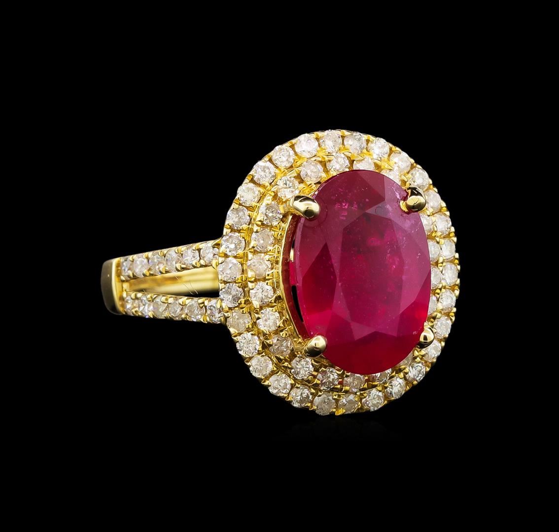 One electronically tested 14KT yellow gold ladies cast ruby and diamond ring with a bright polish finish. Identified with markings of "14K". Condition is new. Containing: One prong set oval modified brilliant cut natural ruby, measuring 12.00 x 8.00 x 5.20mm, approximate weight of 4.25ct., clarity is heavily included, medium, moderately strong, strongly purplish red color, (GIA stpR 5/4), cut is good. Seventy-Five prong set round brilliant cut diamonds, measuring 1.30 - 1.30 x 0.78mm (depth est.) approximate total weight of 75 Stones = 0.60ct. Clarity: I-1 to I-2. Color: J - K. Colored gemstones are presumed to have been subjected to commonly used enhancement processes. All diamonds and colored gemstones are graded in the mounting, unless otherwise stated. Total Weight of Colored Stones 4.25ct. Total Weight of Diamonds 0.60ct. Total Weight of Ring 4.90 grams. GGL Appraised at $3,215.00.