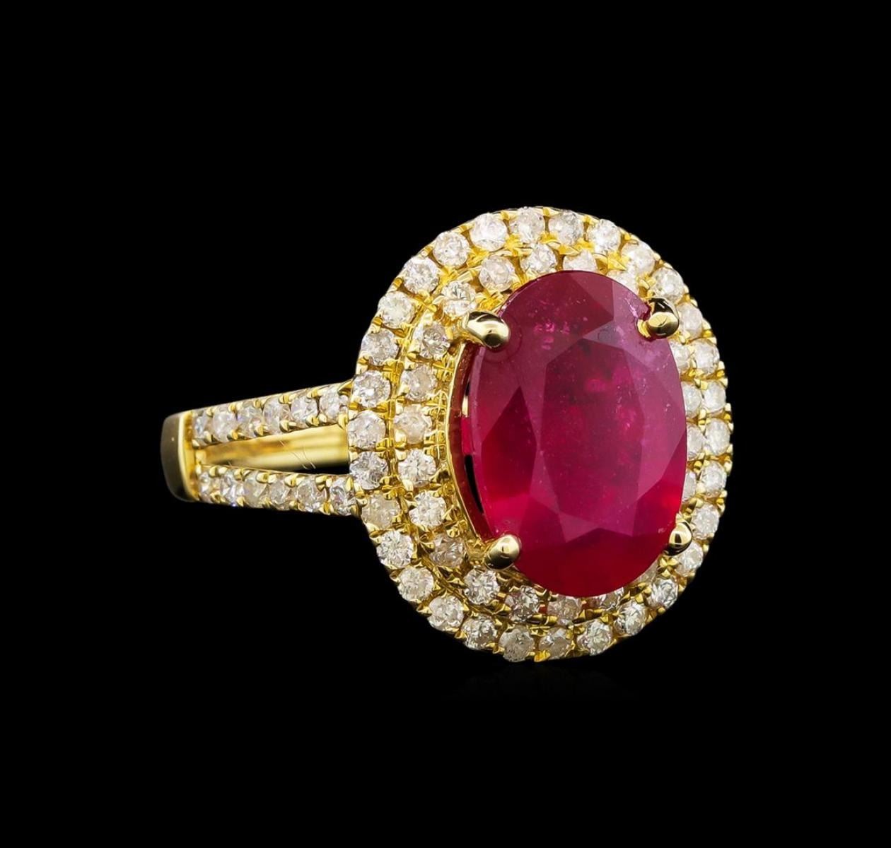 One electronically tested 14KT yellow gold ladies cast ruby and diamond ring with a bright polish finish. Identified with markings of "14K". Condition is new. Containing: One prong set oval modified brilliant cut natural ruby, measuring 12.00 x 8.00 x 5.20mm, approximate weight of 4.25ct., clarity is heavily included, medium, moderately strong, strongly purplish red color, (GIA stpR 5/4), cut is good. Seventy-Five prong set round brilliant cut diamonds, measuring 1.30 - 1.30 x 0.78mm (depth est.) approximate total weight of 75 Stones = 0.60ct. Clarity: I-1 to I-2. Color: J - K. Colored gemstones are presumed to have been subjected to commonly used enhancement processes. All diamonds and colored gemstones are graded in the mounting, unless otherwise stated. Total Weight of Colored Stones 4.25ct. Total Weight of Diamonds 0.60ct. Total Weight of Ring 4.90 grams. GGL Appraised.