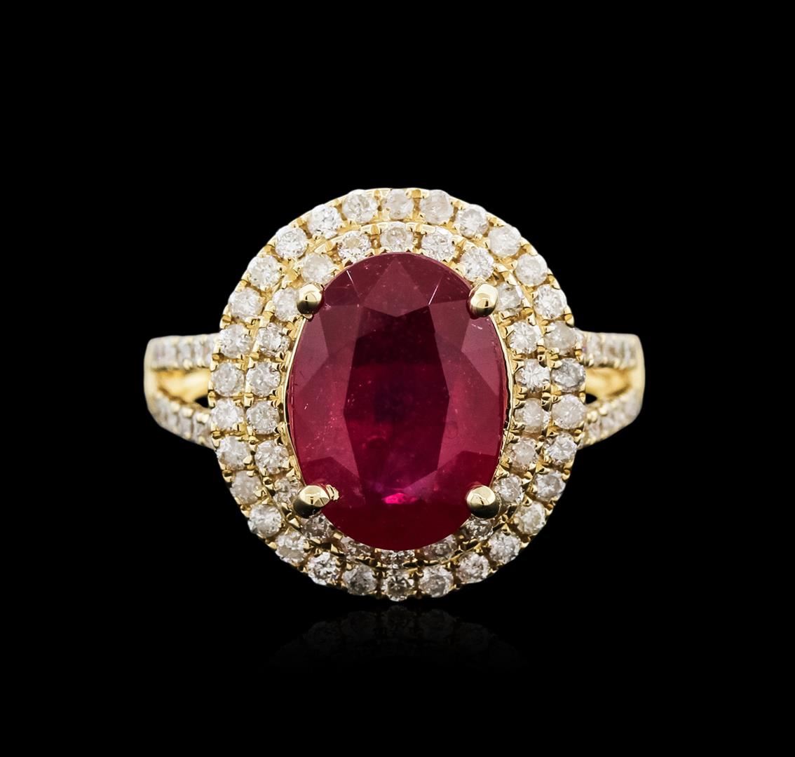 One electronically tested 14KT yellow gold ladies cast ruby and diamond ring with a bright polish finish. Identified with markings of "14K". Condition is new. Containing: One prong set oval modified brilliant cut natural ruby, measuring 12.00 x 8.00 x 5.20mm, approximate weight of 4.25ct., clarity is heavily included, medium, moderately strong, strongly purplish red color, (GIA stpR 5/4), cut is good. Seventy-Five prong set round brilliant cut diamonds, measuring 1.30 - 1.30 x 0.78mm (depth est.) approximate total weight of 75 Stones = 0.60ct. Clarity: I-1 to I-2. Color: J - K. Colored gemstones are presumed to have been subjected to commonly used enhancement processes. All diamonds and colored gemstones are graded in the mounting, unless otherwise stated. Total Weight of Colored Stones 4.25ct. Total Weight of Diamonds 0.60ct. Total Weight of Ring 4.90 grams. GGL Appraised at $3,215.00.