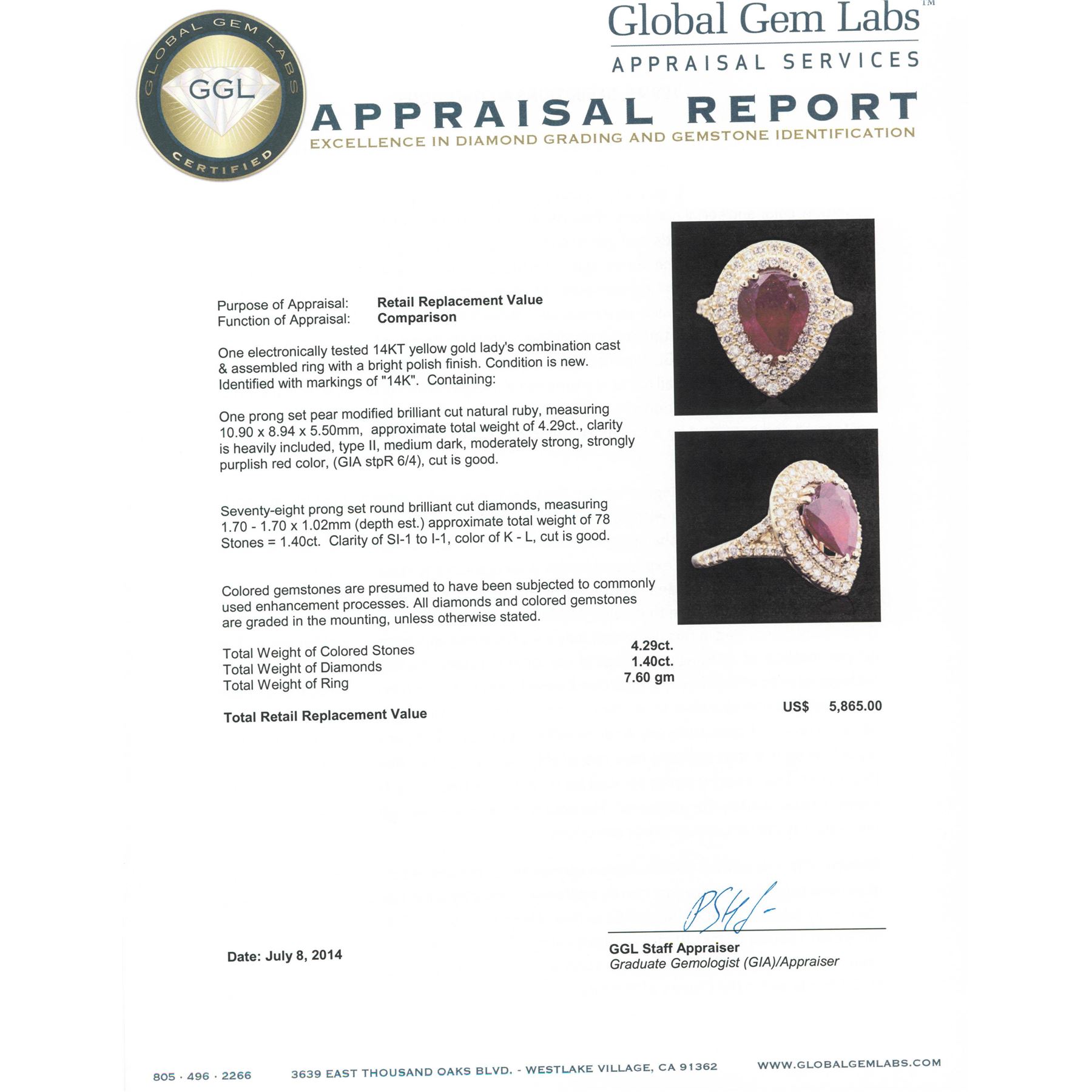 One electronically tested 14KT yellow gold Ladies combination cast & assembled ring with a bright polish finish. Condition is new. Identified with markings of "14K". Containing: One prong set pear modified brilliant cut natural ruby, measuring 10.90 x 8.94 x 5.50mm, approximate. Total Weight of 4.29ct., clarity is heavily included, type II, medium dark, moderately strong, strongly purplish red color, (GIA stpR 6/4), cut is good. Seventy-Eight prong set round brilliant cut diamonds, measuring 1.70 - 1.70 x 1.02mm (depth est.) approximate. Total Weight of 78 Stones = 1.40ct. Clarity: SI-1 to I-1. Color: K - L, Cut is Good. Colored gemstones are presumed to have been subjected to commonly used enhancement processes. All diamonds and colored gemstones are graded in the mounting, unless otherwise stated. Total Weight of Colored Stones 4.29ct. Total Weight of Diamonds 1.40ct. Total Weight of Ring 7.60 grams. GGL Appraised at $5,865.00.