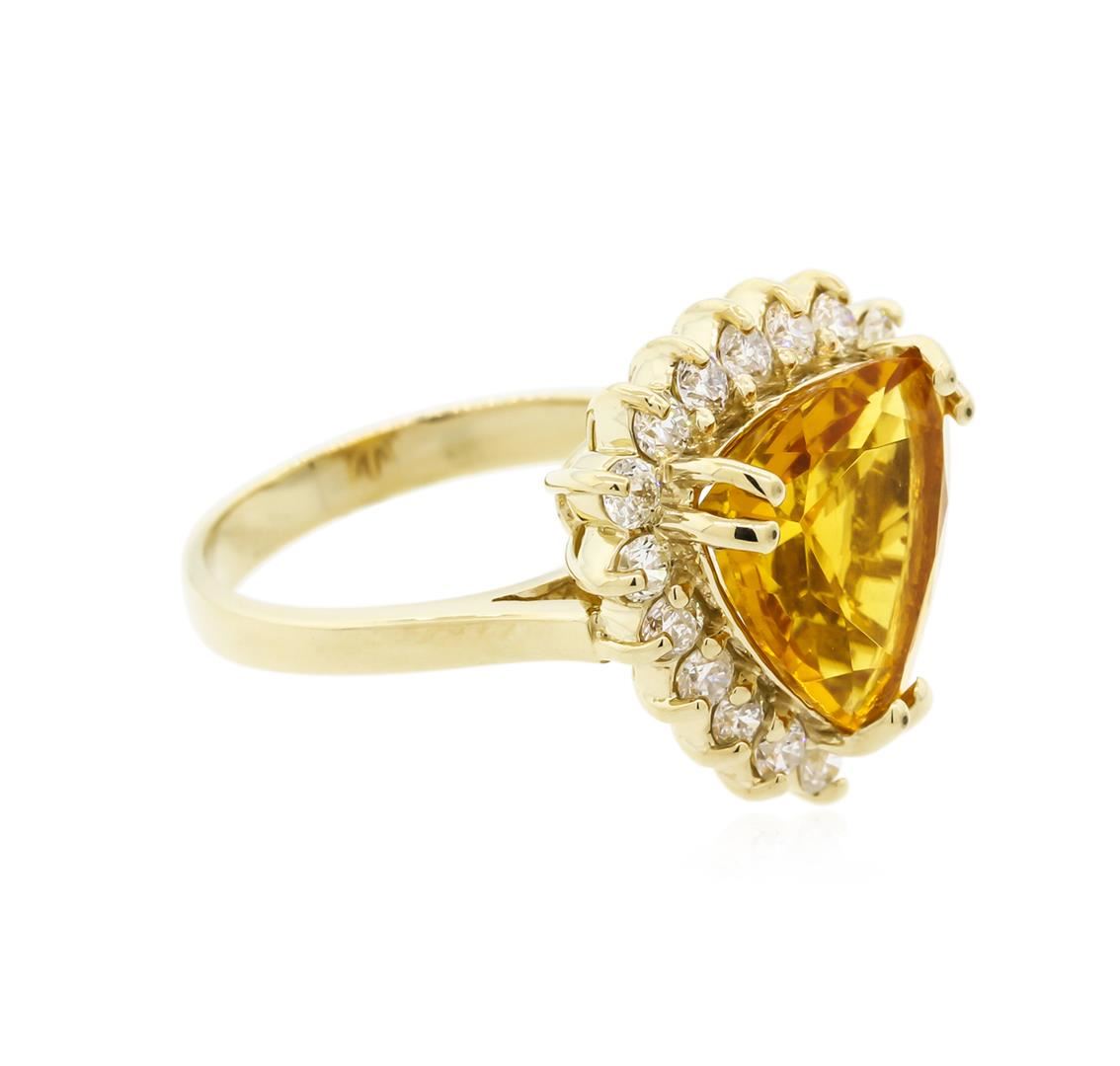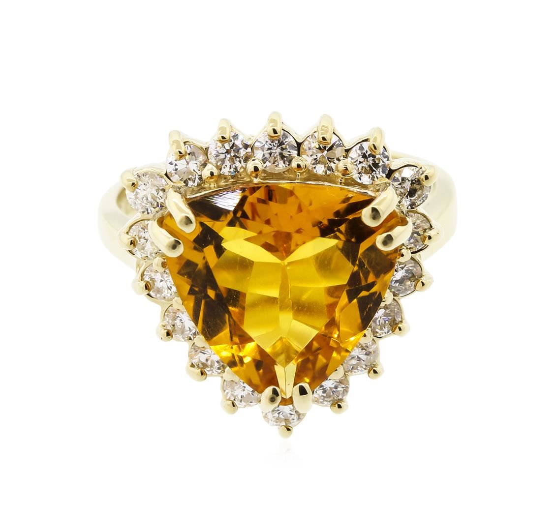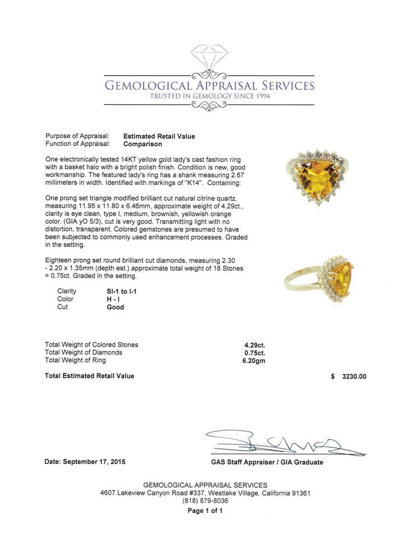 One electronically tested 14KT yellow gold lady's cast fashion ring with a basket halo with a bright polish finish. The featured lady's ring has a shank measuring 2.67 millimeters in width. Identified with markings of "K14". Condition is new, good workmanship. Containing: One prong set triangle modified brilliant cut natural citrine quartz, measuring 11.95 x 11.80 x 6.46mm, approximate weight of 4.29ct., clarity is eye clean, type I, medium, brownish, yellowish orange color, (GIA yO 5/3), cut is very good. Transmitting light with no distortion, transparent. Colored gemstones are presumed to have been subjected to commonly used enhancement processes. Graded in the setting. Eighteen prong set round brilliant cut diamonds, measuring 2.30 - 2.20 x 1.35mm (depth est.) approximate total weight of 18 Stones = 0.75ct. Graded in the setting. Clarity: SI-1 to I-1. Color: H - I. Cut Good. Total Weight of Colored Stones 4.29ct. Total Weight of Diamonds 0.75ct. Total Weight of Ring 6.20gm. GAS Appraised at $3,230.00.