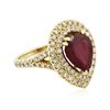 One electronically tested 14KT yellow gold Ladies combination cast & assembled ring with a bright polish finish. Condition is new. Identified with markings of "14K". Containing: One prong set pear modified brilliant cut natural ruby, measuring 10.90 x 8.94 x 5.50mm, approximate. Total Weight of 4.29ct., clarity is heavily included, type II, medium dark, moderately strong, strongly purplish red color, (GIA stpR 6/4), cut is good. Seventy-Eight prong set round brilliant cut diamonds, measuring 1.70 - 1.70 x 1.02mm (depth est.) approximate. Total Weight of 78 Stones = 1.40ct. Clarity: SI-1 to I-1. Color: K - L, Cut is Good. Colored gemstones are presumed to have been subjected to commonly used enhancement processes. All diamonds and colored gemstones are graded in the mounting, unless otherwise stated. Total Weight of Colored Stones 4.29ct. Total Weight of Diamonds 1.40ct. Total Weight of Ring 7.60 grams. GGL Appraised at $5,865.00.